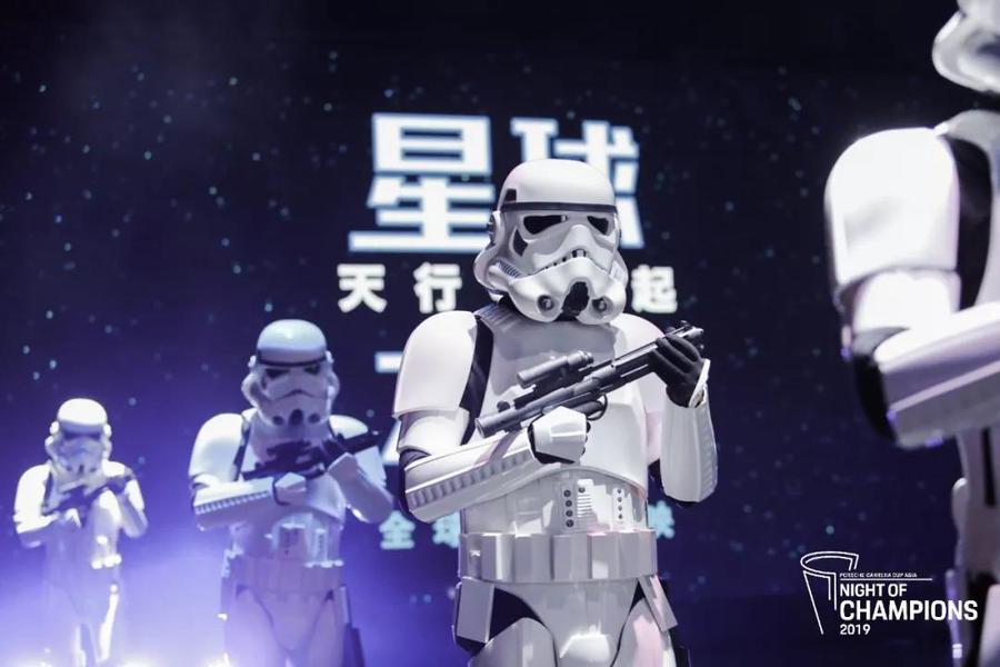 當(dāng)晚的晚宴舞臺(tái)燈光驟暗,一隊(duì)暴風(fēng)兵在星球大戰(zhàn)經(jīng)典背景音樂的節(jié)奏下突然出現(xiàn),列隊(duì)舞臺(tái)兩側(cè),與此同時(shí),一臺(tái)保時(shí)捷Taycan Turbo S緩緩駛出,保時(shí)捷旗下首款純電動(dòng)跑車極致簡(jiǎn)約的外觀造型與暴風(fēng)兵盔甲的設(shè)計(jì)感相得益彰,現(xiàn)場(chǎng)來賓無不驚嘆連連。這一精心策劃的舞臺(tái)展示,也是為不久之后亮相的保時(shí)捷與盧卡斯影業(yè)(Lucasfilm Ltd.)合作設(shè)計(jì)的夢(mèng)幻星際飛船埋下伏筆。