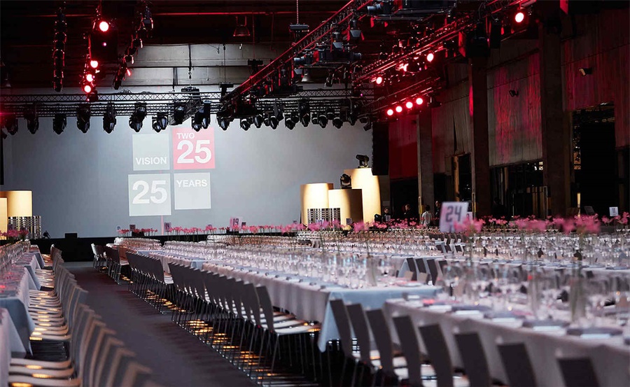 Progroup AG是歐洲瓦楞工業(yè)環(huán)保政策的先行者,全球著名的包裝材料供應商。在短短25年的時間里,Progroup AG通過創(chuàng)新的解決方案顛覆了瓦楞紙板包裝市場。為了慶祝公司誕辰25周年,主辦方把舊的廠房被改造成了活動現(xiàn)場,為700名左右的客人創(chuàng)造了一場令人印象深刻的感官體驗。首先迎接來賓的是通過單獨設計的現(xiàn)場展示裝置和多媒體體驗來引導客人們了解,品牌在過去25年中所逐步形成的創(chuàng)新文化,以及在歐洲范圍內(nèi)的快速擴張以及成功背后的切實可見的實證。在改建的宴會區(qū),向來賓和政界名流展示了公司成功的故事,宴會中為來賓們提供了各種豐富的明星美食。