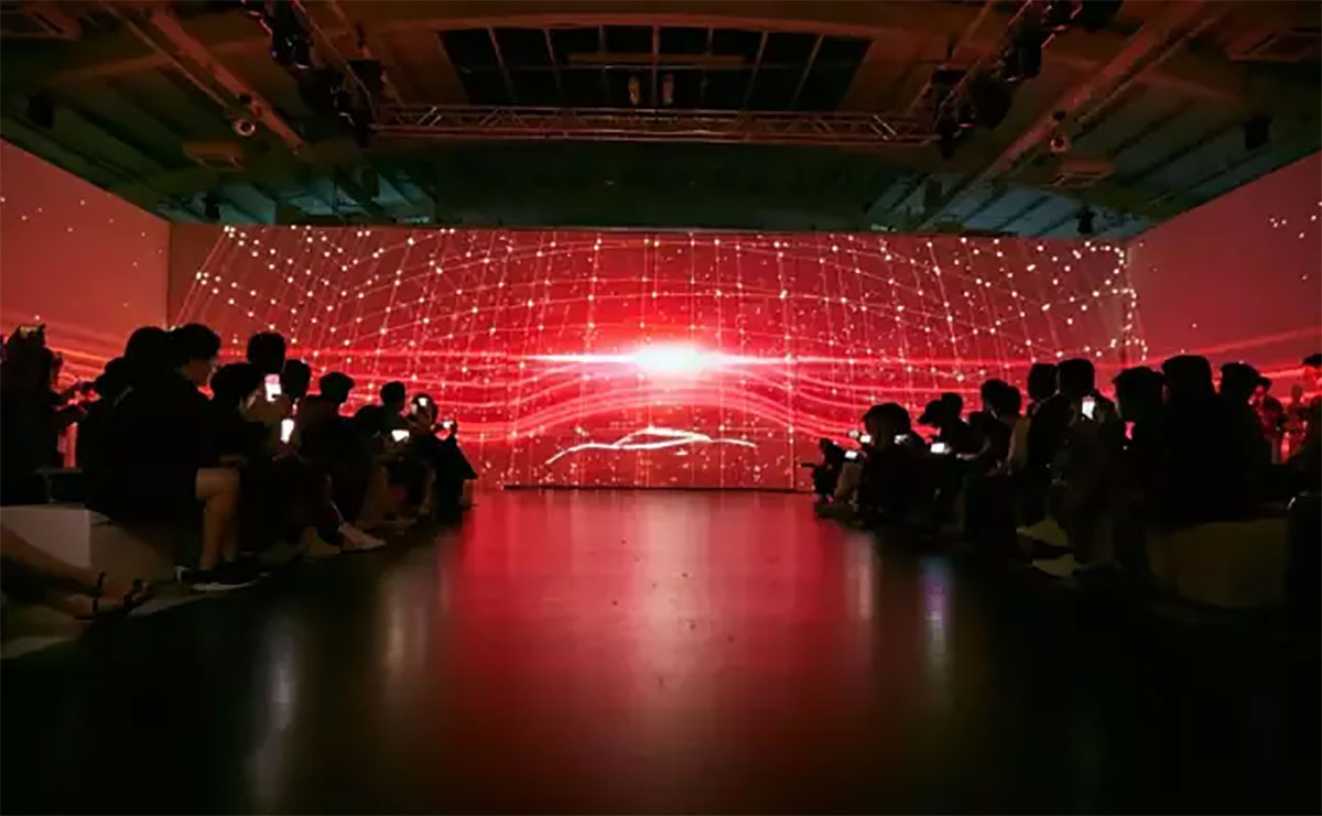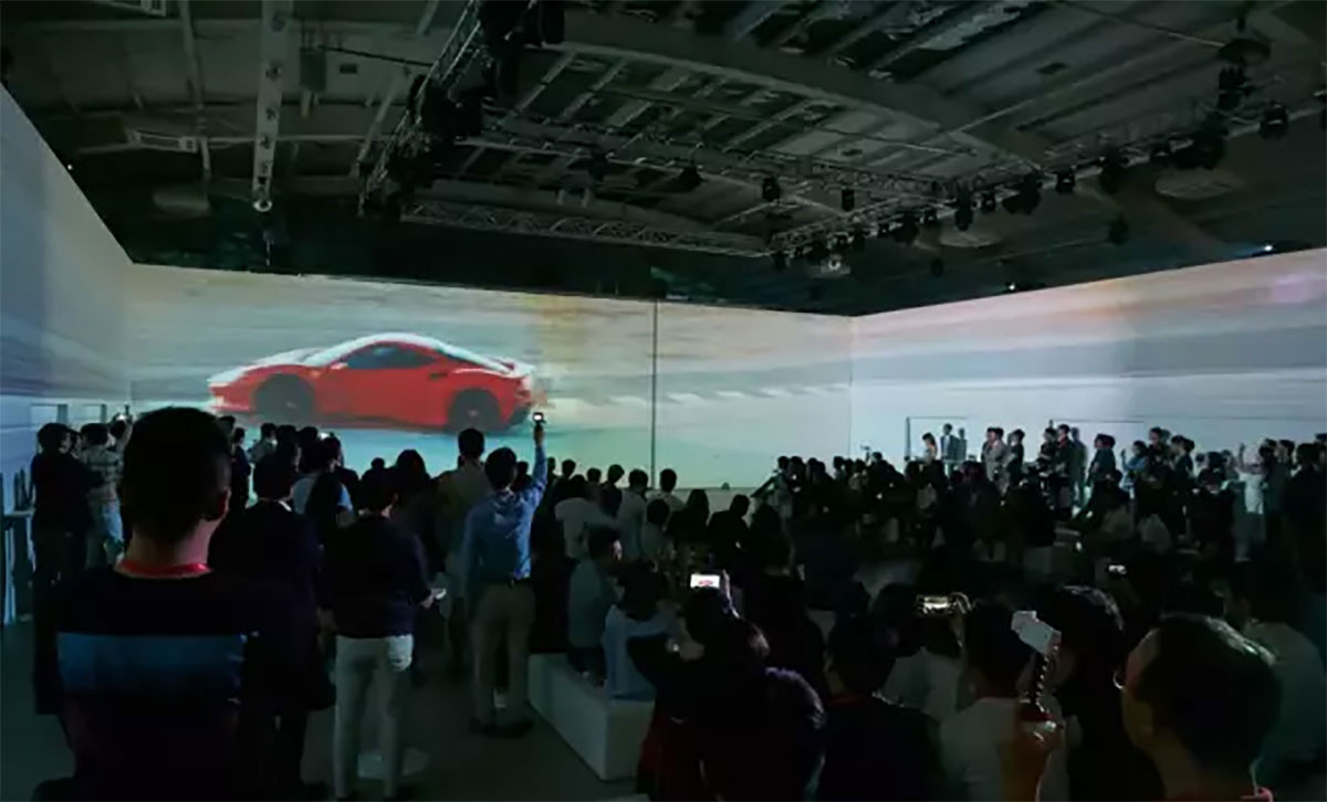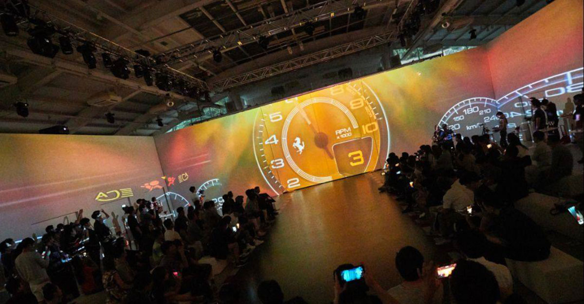 該活動(dòng)采用了巨大的三面投影屏幕,三面投影讓觀眾擁有更廣闊的視野,被法拉利高科技包圍的感覺特別強(qiáng)烈。主舞臺(tái)和觀眾區(qū)沒有出發(fā),但采用了時(shí)裝秀的T臺(tái),觀眾可以更加緊密地參加會(huì)議,更具互動(dòng)性。整個(gè)活動(dòng)場地變成了一個(gè)容光煥發(fā)的視聽享受景觀空間,為客人創(chuàng)造了前所未有的沉浸式環(huán)境,讓觀眾驚嘆不已。