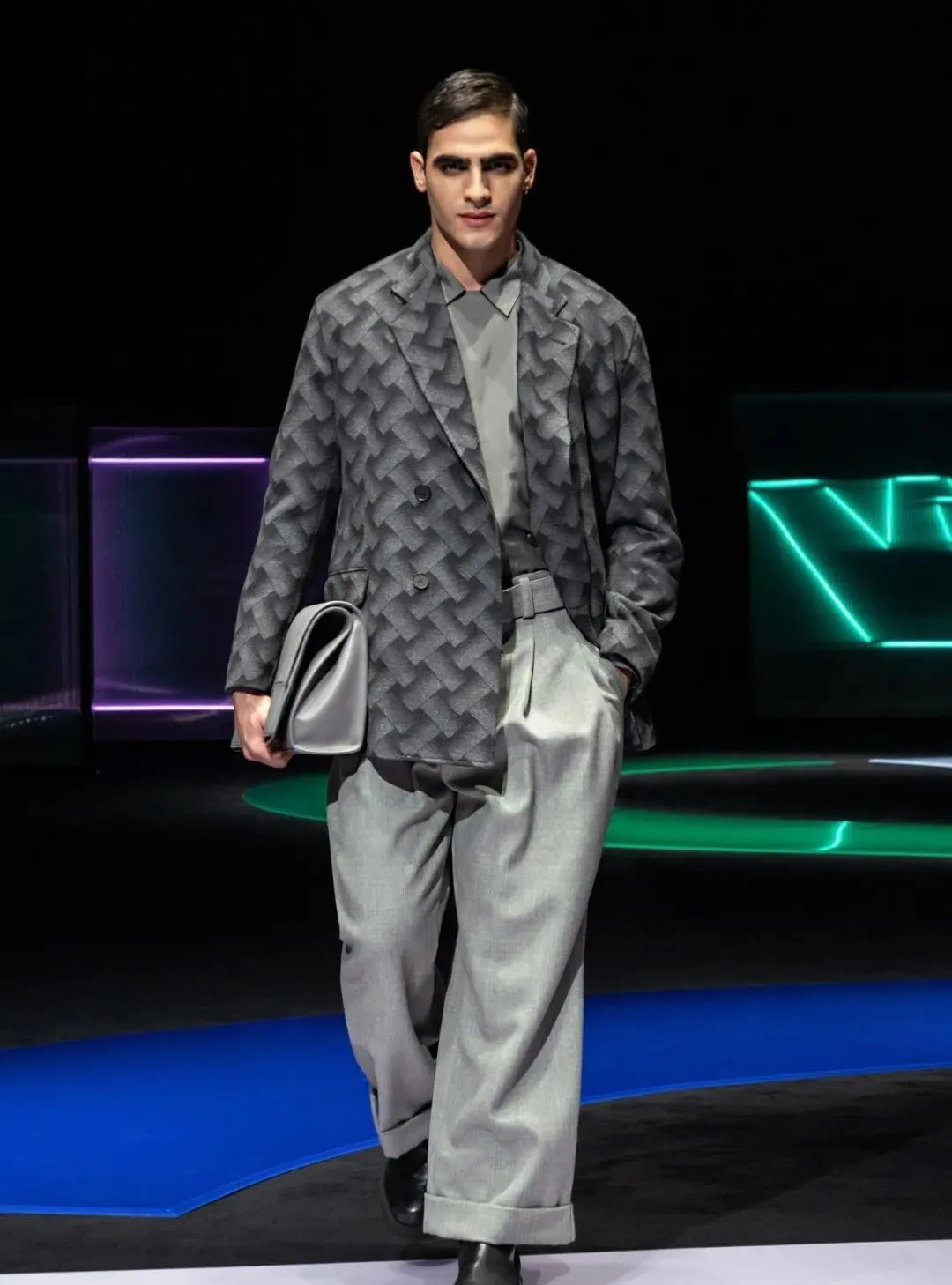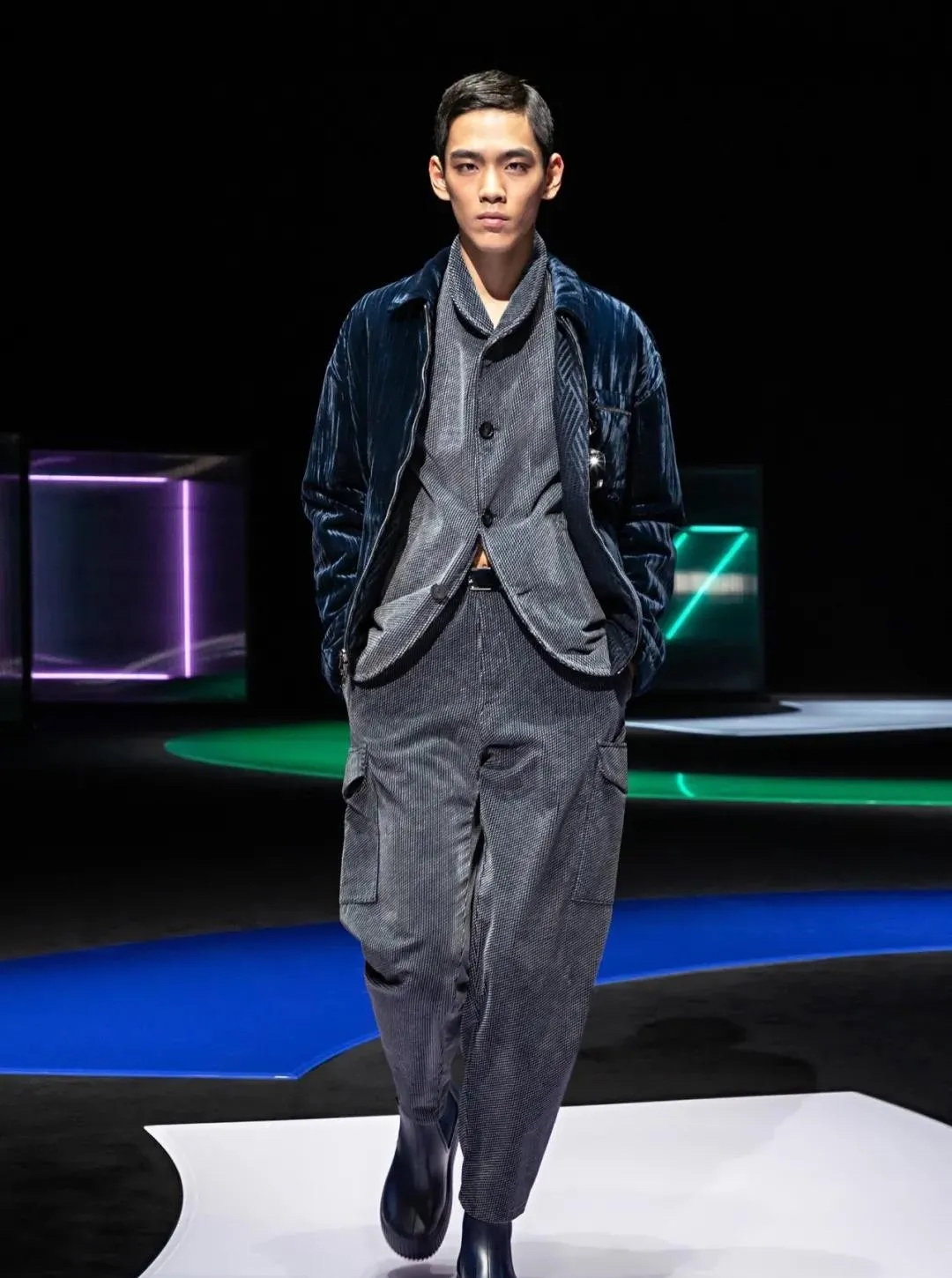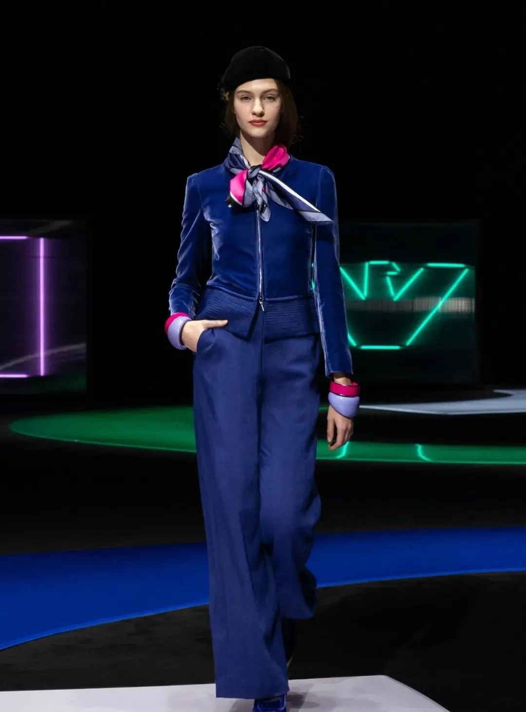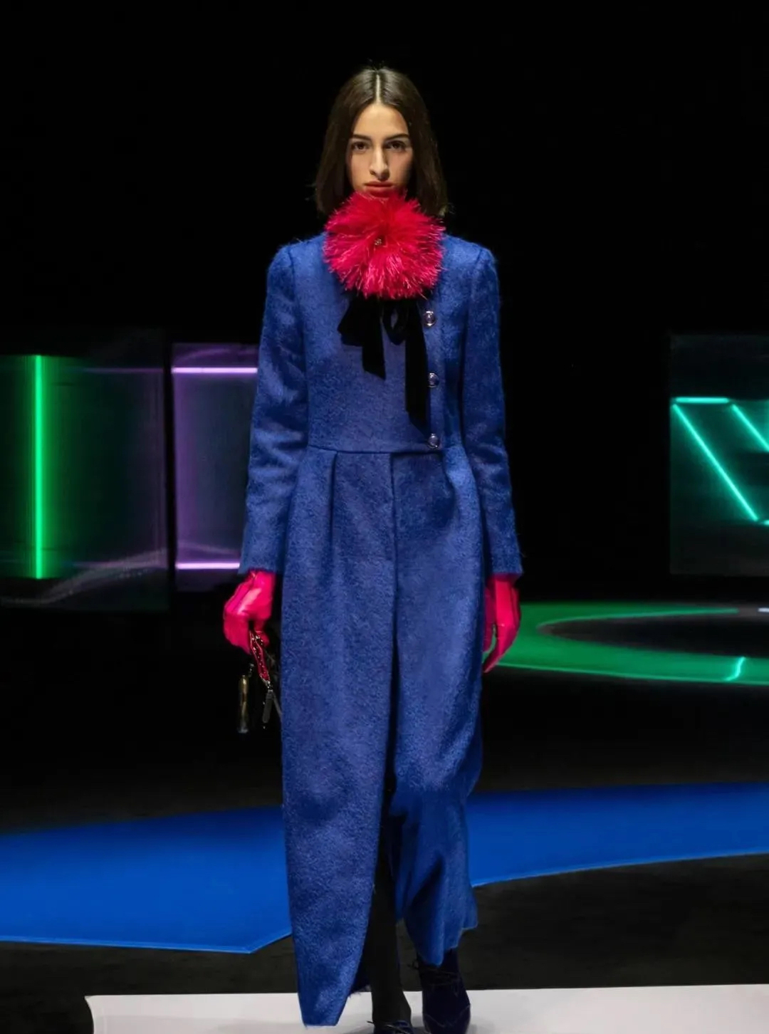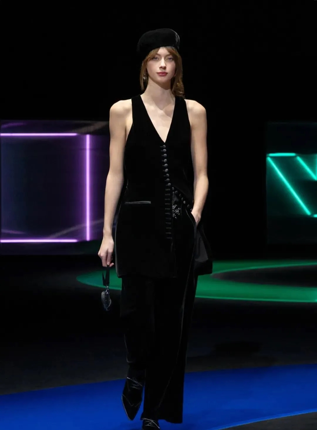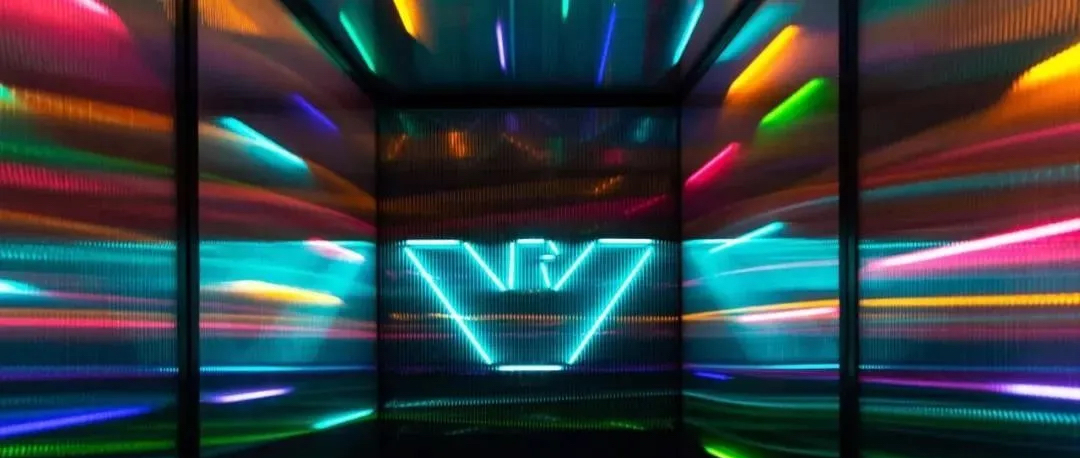 阿瑪尼Giorgio Armani 2021秋冬男女裝系列時裝秀秀場以霓虹色裝飾,彌漫著80年代的迷人氣氛,與80年代迷人的時髦基因共同搖擺Pop新浪潮。