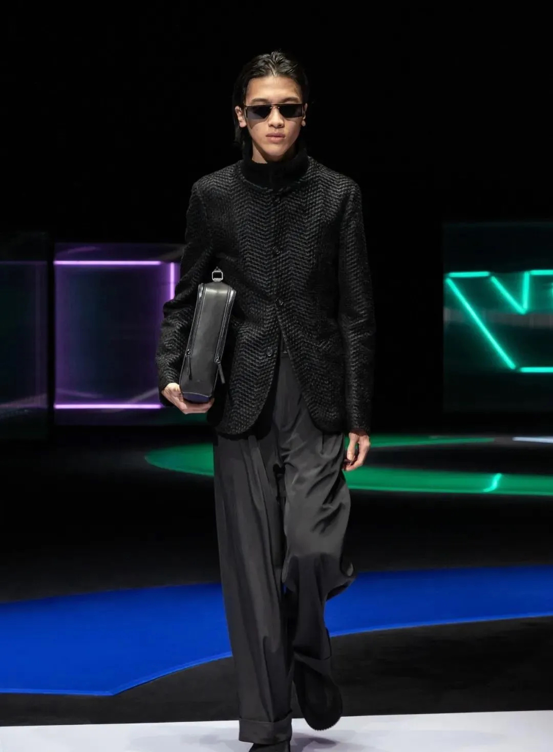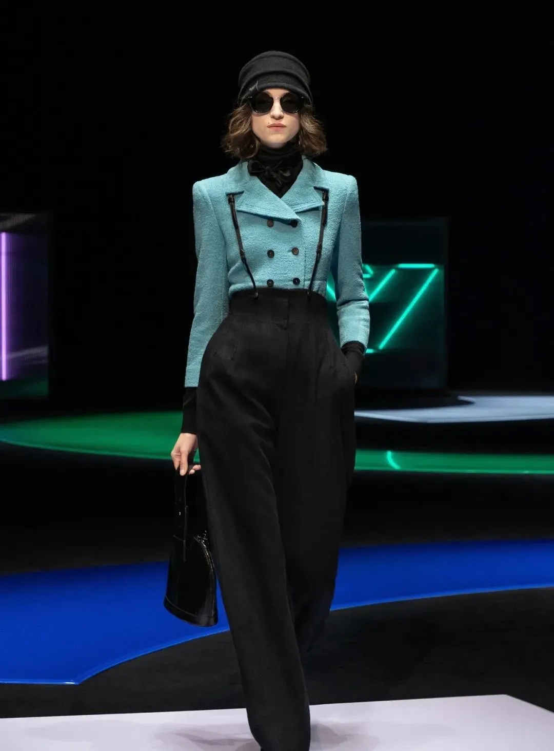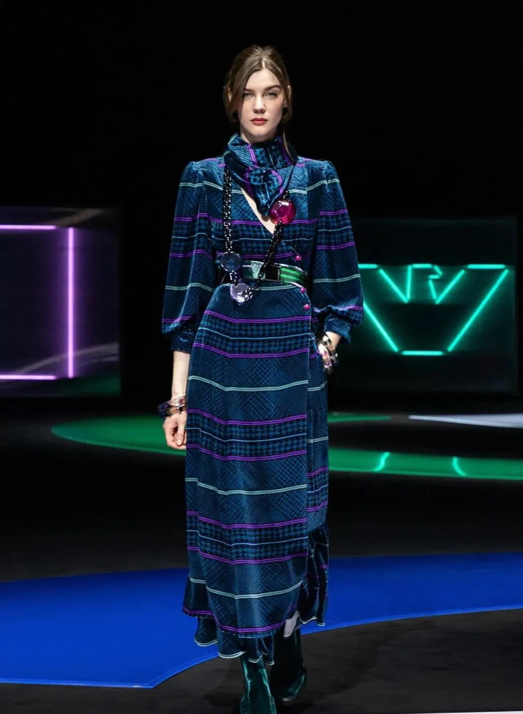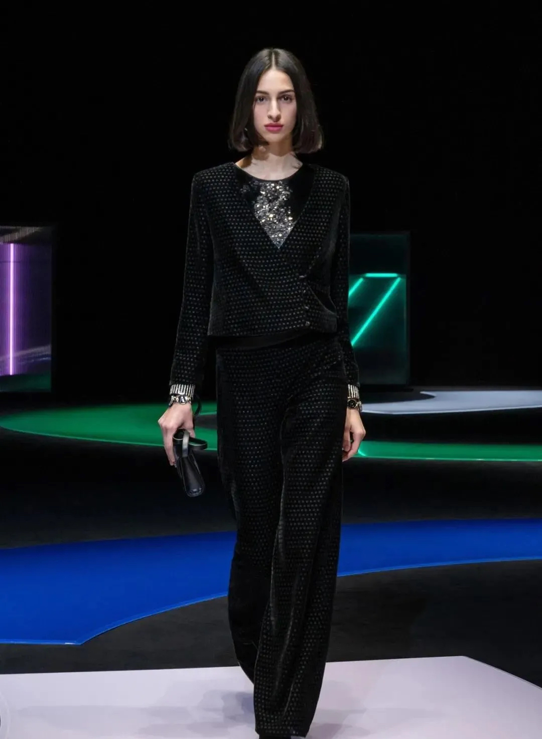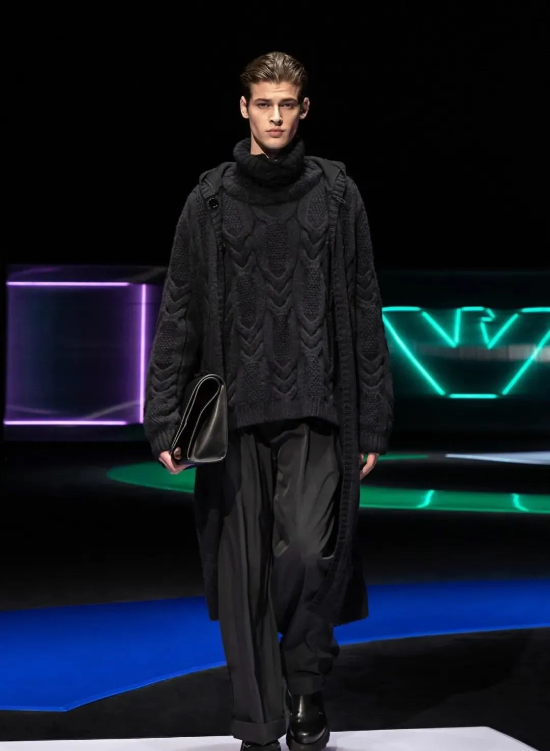 阿瑪尼Giorgio Armani 2021秋冬男女裝系列時裝秀秀場以霓虹色裝飾,彌漫著80年代的迷人氣氛,與80年代迷人的時髦基因共同搖擺Pop新浪潮。