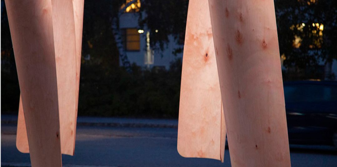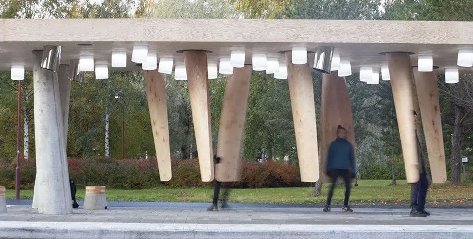 這些大木頭被制成卷曲狀,就像竹筍的外皮一樣,被吊裝在候車(chē)站的遮蔽下,還帶有如轉(zhuǎn)椅一樣的,360°旋轉(zhuǎn)功能。這個(gè)創(chuàng)新的設(shè)計(jì)簡(jiǎn)直神來(lái)之筆,它輕松解決了兩個(gè)大問(wèn)題:一個(gè)是躲避寒風(fēng),因?yàn)樵谶@個(gè)卷曲木板庇護(hù)里,你可以完美的把風(fēng)擋在背后,而且因?yàn)樗?60°旋轉(zhuǎn),所以隨時(shí)能擋任何方向的風(fēng)!你吹任你吹,怎么吹也刮不著我。