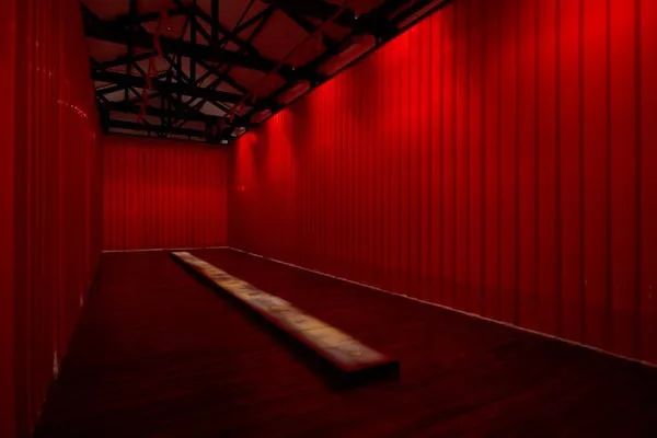 在達(dá)令赫斯特國(guó)立藝術(shù)學(xué)院,墨西哥藝術(shù)家特蕾莎·瑪格麗絲(Teresa Margolles)安置了作品《無(wú)題(Untitled),2020》。這件作品是以鮮紅色的窗簾打造出的長(zhǎng)長(zhǎng)的矩形房間,內(nèi)部是加熱的金屬板,水滴從上方滴落到金屬板上。當(dāng)水滴撞擊表面時(shí),它們會(huì)在少量蒸汽中蒸發(fā),但會(huì)留下痕跡。這項(xiàng)作品為墨西哥被謀殺的婦女們提供了有力的紀(jì)念。在墨西哥,每月都有數(shù)百名女性被殺害。