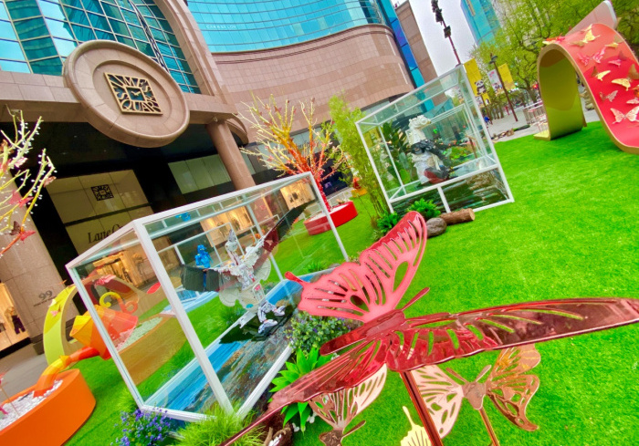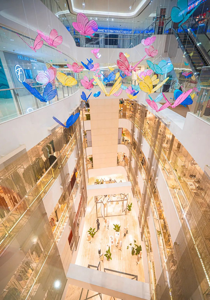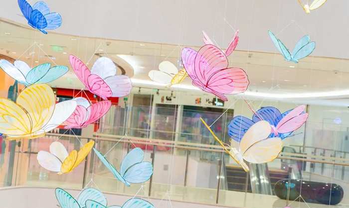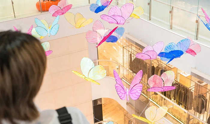 裝置展中還有翩翩起舞的蝴蝶,代表著對(duì)未來(lái)的愛(ài)和期望。同時(shí),商場(chǎng)里還有更多驚喜等邂逅。抬頭便是出乎意料的美景,夢(mèng)幻的蝴蝶漂浮在半空中,一直延伸到商場(chǎng)的頂部,讓人感覺(jué)仿佛陷入了春日花園。