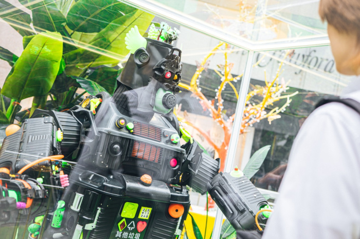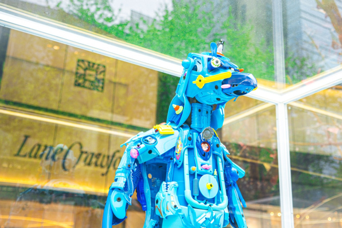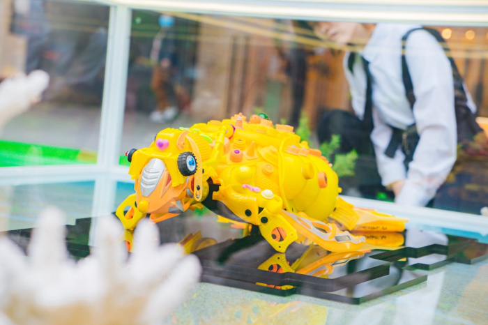 現(xiàn)場(chǎng)讓人移不開(kāi)目光的,還有這位威武有力的帝企鵝。由飛機(jī)玩具,水槍等組成肅穆的神情、筆直的身軀,就像是一位正在守衛(wèi)族群的統(tǒng)領(lǐng)。通體標(biāo)志性的海洋藍(lán),似乎也在提醒著大家,要守護(hù)海洋、守護(hù)水資源。