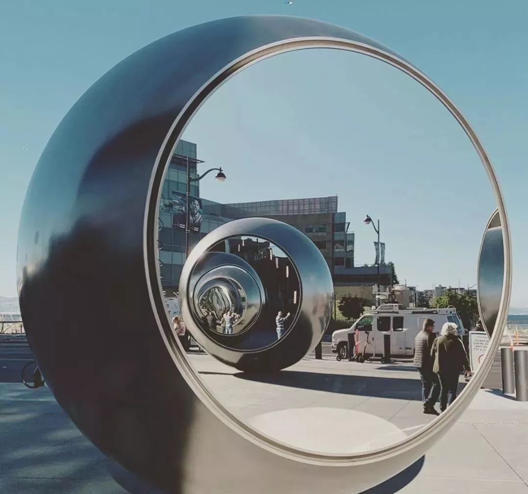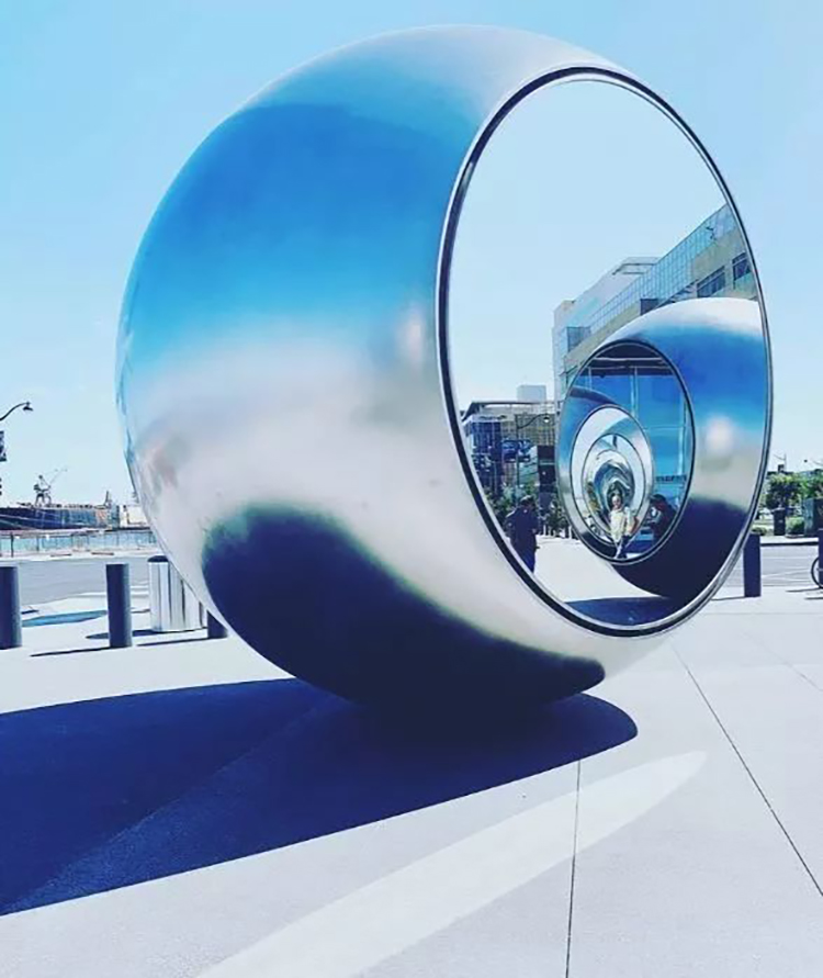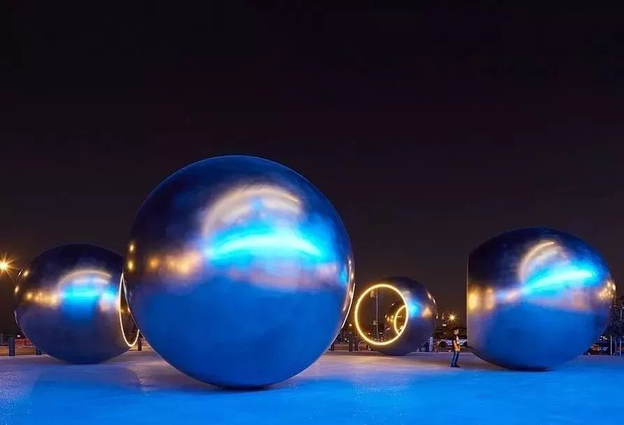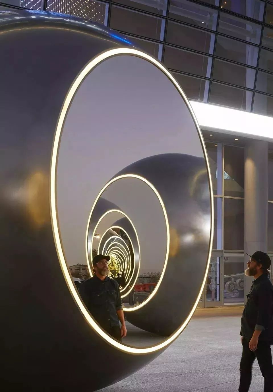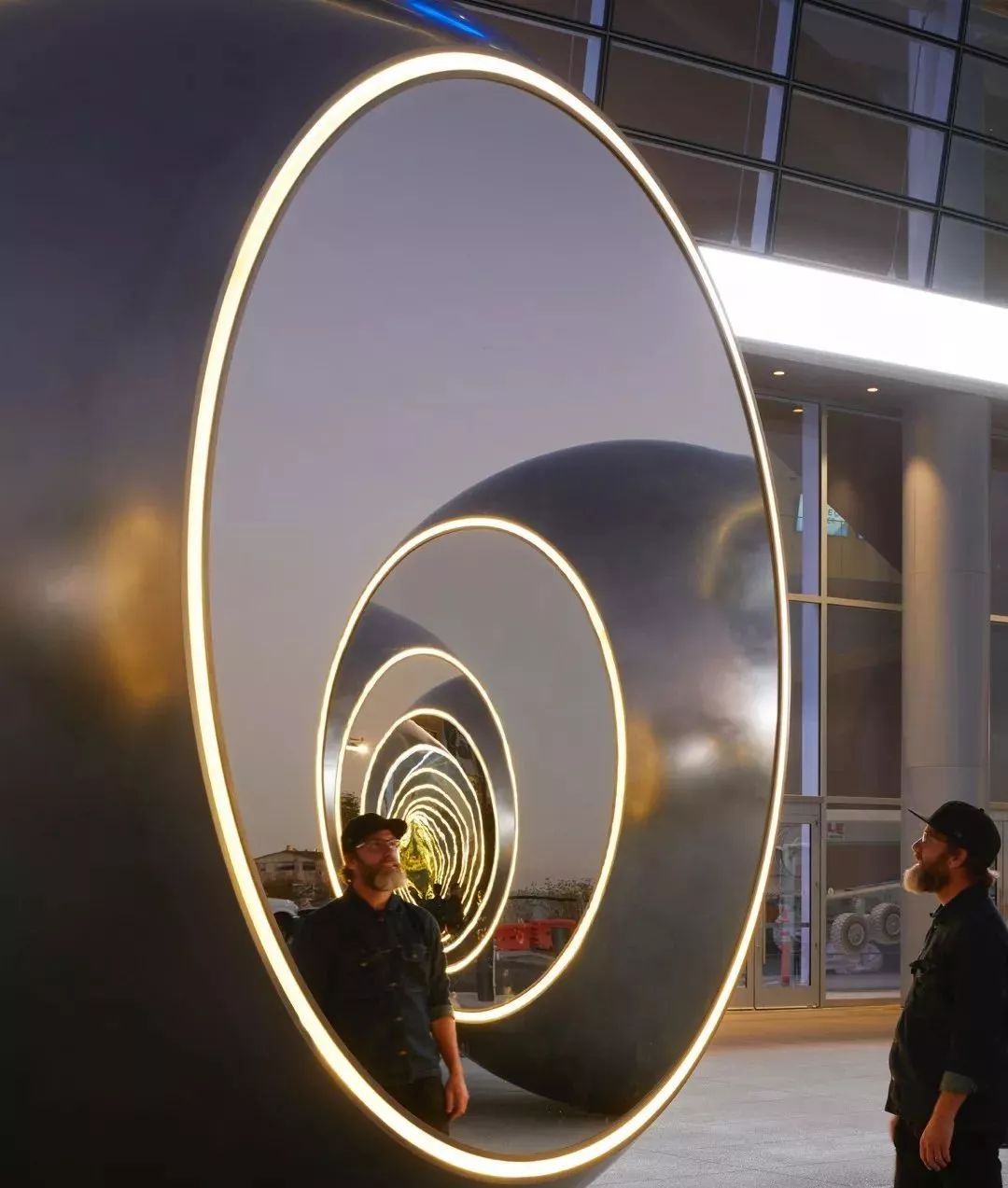 Seeing Spheres由5個(gè)高度為15.5英尺、液壓成形的拋光鋼制球體組成,圍繞著一個(gè)中央空間形成一個(gè)大圓。每個(gè)球體都嵌入了一個(gè)扁平的圓形鏡面,并以LED燈環(huán)作為邊框,將周圍其他球體中的鏡像反射出來,從而共同形成了一種出人意料的多層次的反射空間。相同的人和場(chǎng)景通過各種意想不到的角度一次又一次地出現(xiàn),隧道狀的畫面在經(jīng)過無數(shù)次重復(fù)之后最終消失在鏡子的深處。