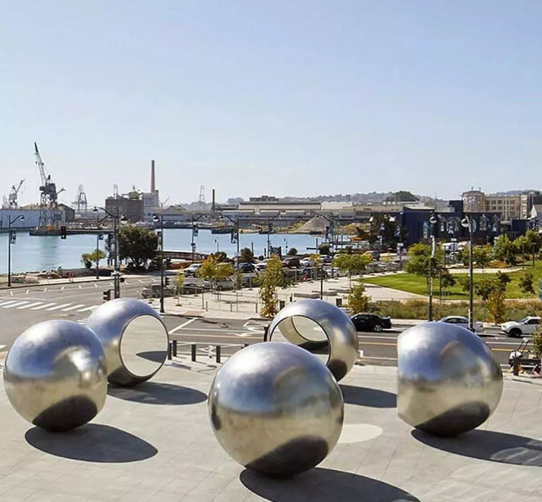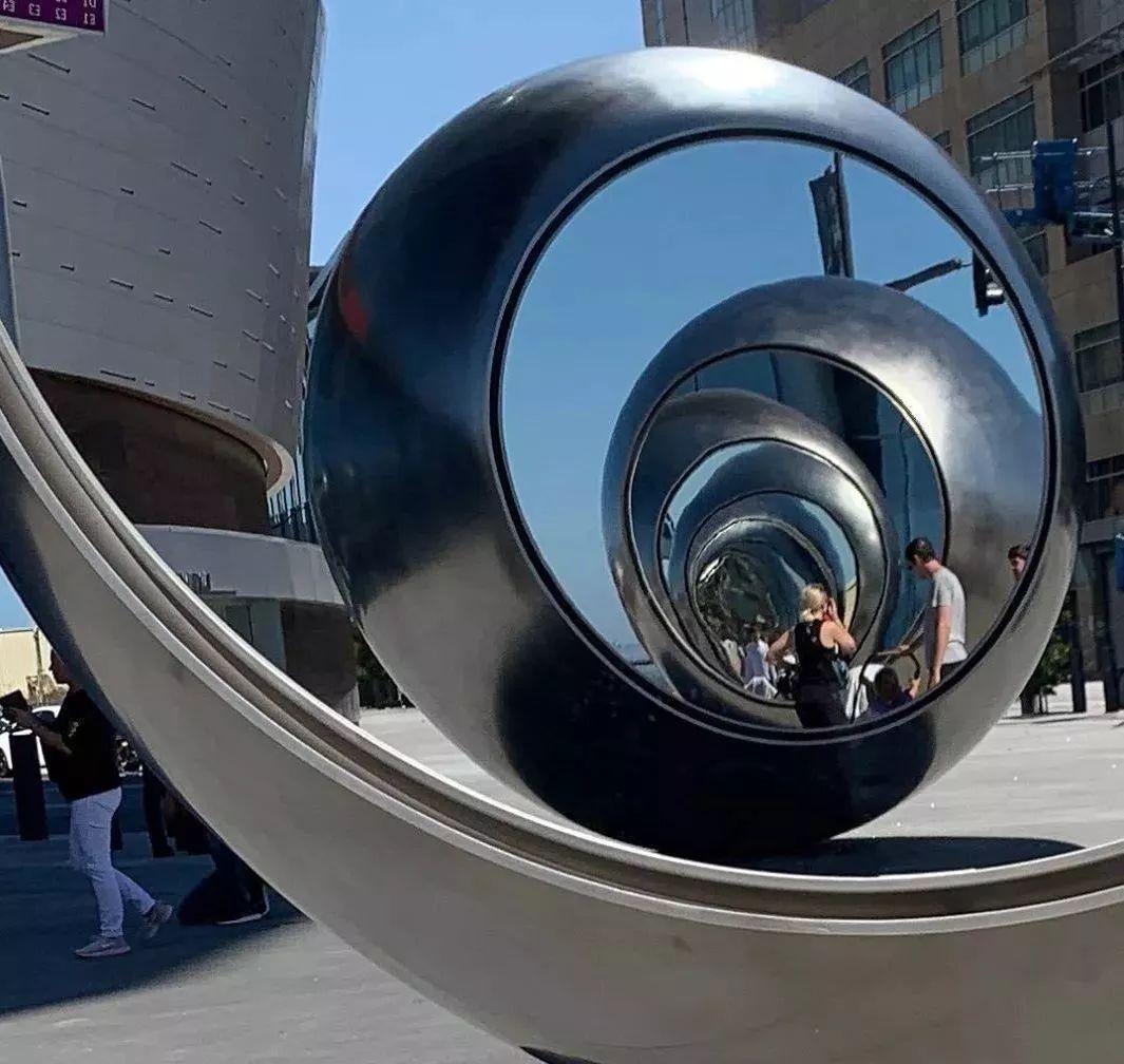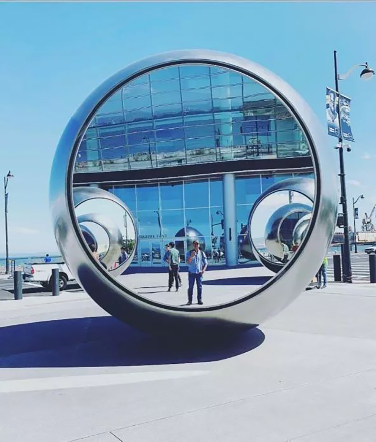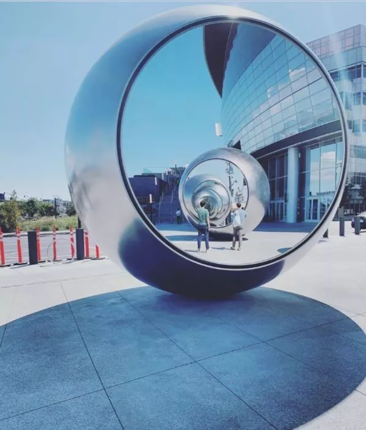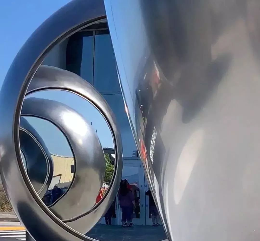 Seeing Spheres由5個(gè)高度為15.5英尺、液壓成形的拋光鋼制球體組成,圍繞著一個(gè)中央空間形成一個(gè)大圓。每個(gè)球體都嵌入了一個(gè)扁平的圓形鏡面,并以LED燈環(huán)作為邊框,將周圍其他球體中的鏡像反射出來,從而共同形成了一種出人意料的多層次的反射空間。相同的人和場(chǎng)景通過各種意想不到的角度一次又一次地出現(xiàn),隧道狀的畫面在經(jīng)過無數(shù)次重復(fù)之后最終消失在鏡子的深處。