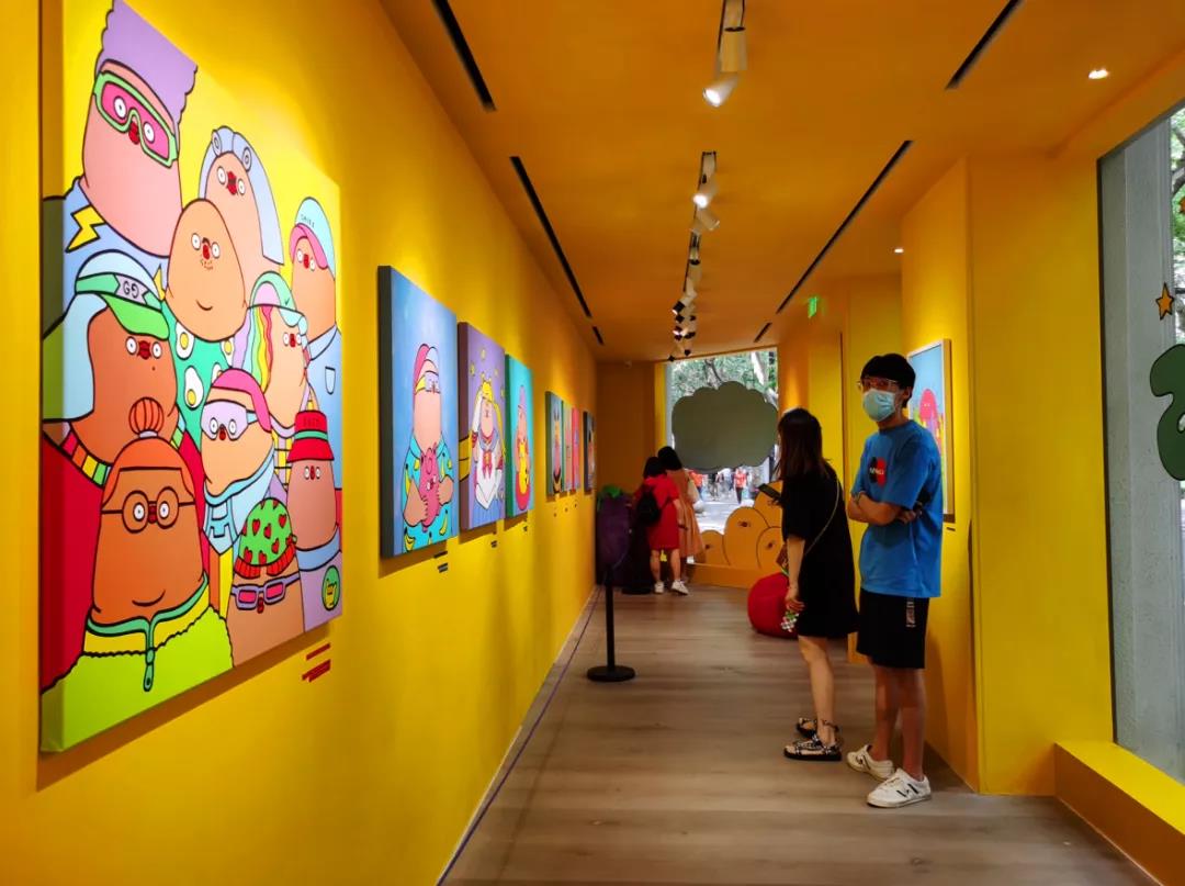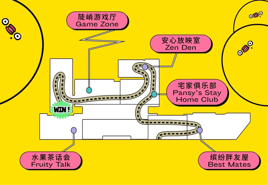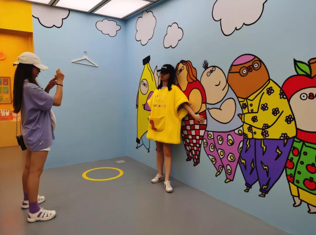 根據(jù)展覽特性,展館被分為5個區(qū)域,分別為水果茶話會、繽紛胖友屋、宅家俱樂部、安心放映室、陡峭游戲廳。