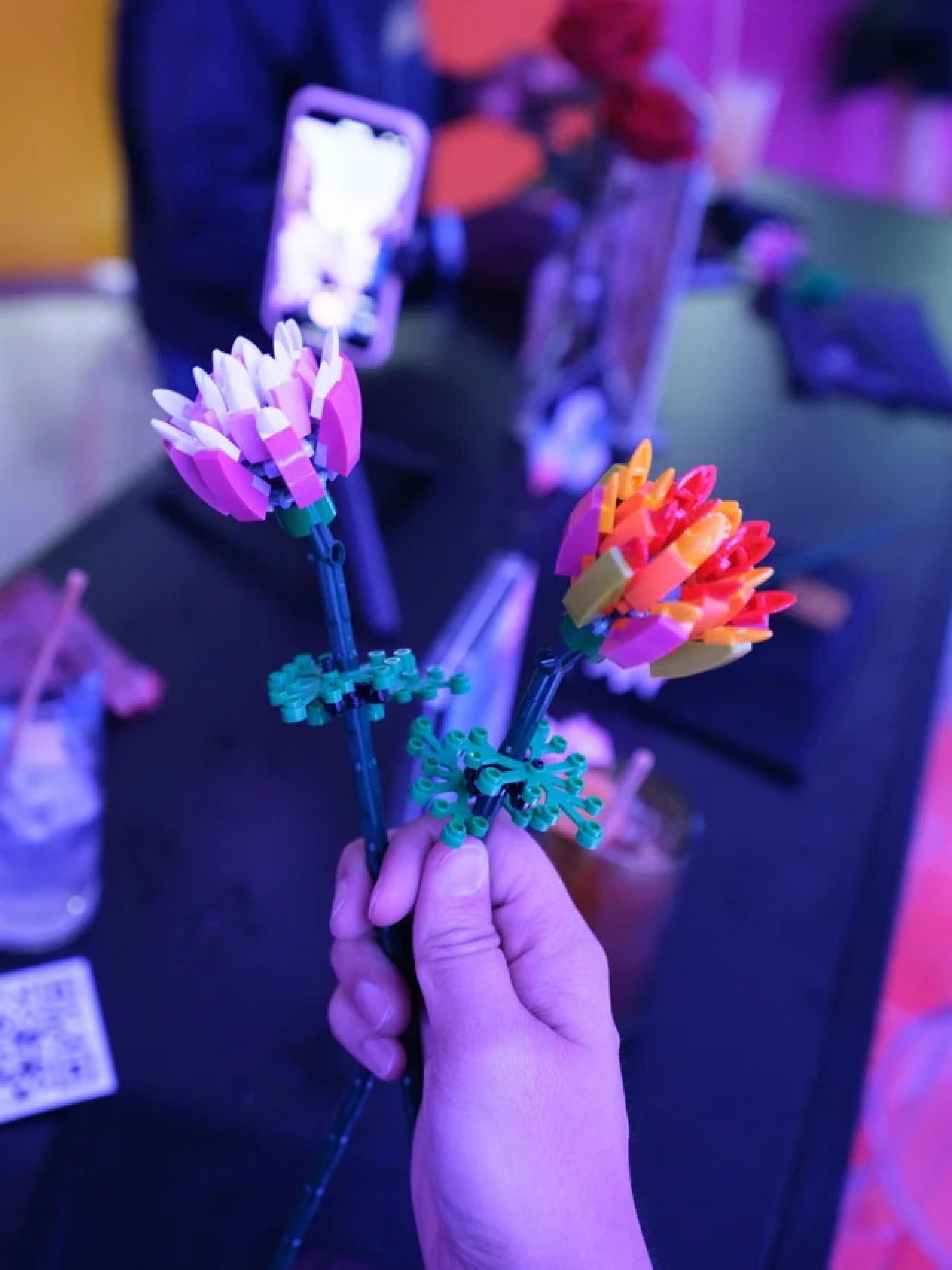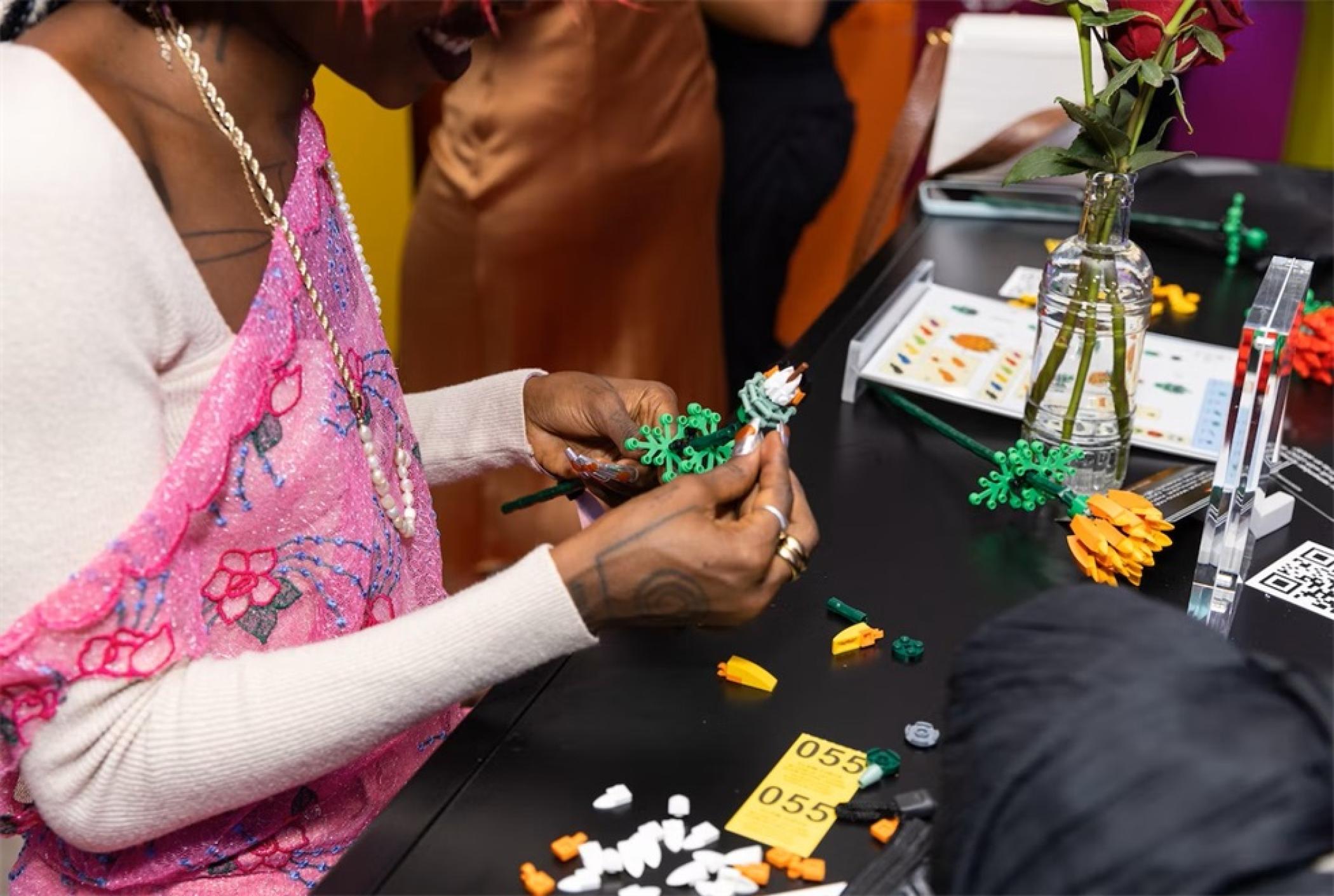 活動通過將樂高搭建時刻與傳統(tǒng)活動元素和萊瑟姆的夸張現(xiàn)場花卉相結(jié)合,這個概念被賦予了生命,萊瑟姆也擔(dān)任了第一天VIP活動的主持人。萊瑟姆和他的團(tuán)隊用鮮花和‘樂高植物’積木組合裝飾了這個空間。麥克納利說,這種平衡需要愿意嘗試、非常仔細(xì)的眼睛和一定程度的藝術(shù)表達(dá)的克制。他說:“我們能夠以一種優(yōu)雅、出人意料的方式把樂高花朵和真正的花朵編織在一起,這就是我們的策略。我們仔細(xì)考慮了如何創(chuàng)造那些讓客人發(fā)現(xiàn)并驚嘆的創(chuàng)意時刻,而不是用‘樂高花朵’塞滿整個空間?!?/p>