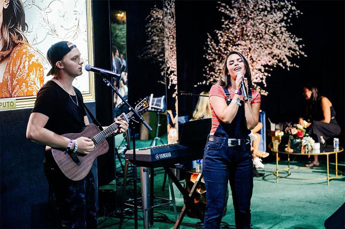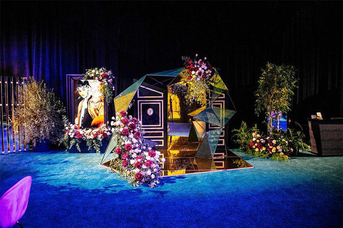 活動現(xiàn)場還使用亞克力金色板材和層疊的花飾制作了一個多面體結構,作為抽象的照相背景,而舞臺上的一面LED墻則被設計用于現(xiàn)場表演的背景墻,整個休息區(qū)域集齊了休息與觀賞的功能,讓人一進入這里就徹底忘記了展會的喧囂和繁雜,壓根就不想再離開這個夢境加入到展會的世俗。
