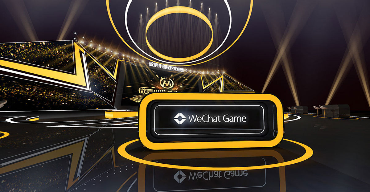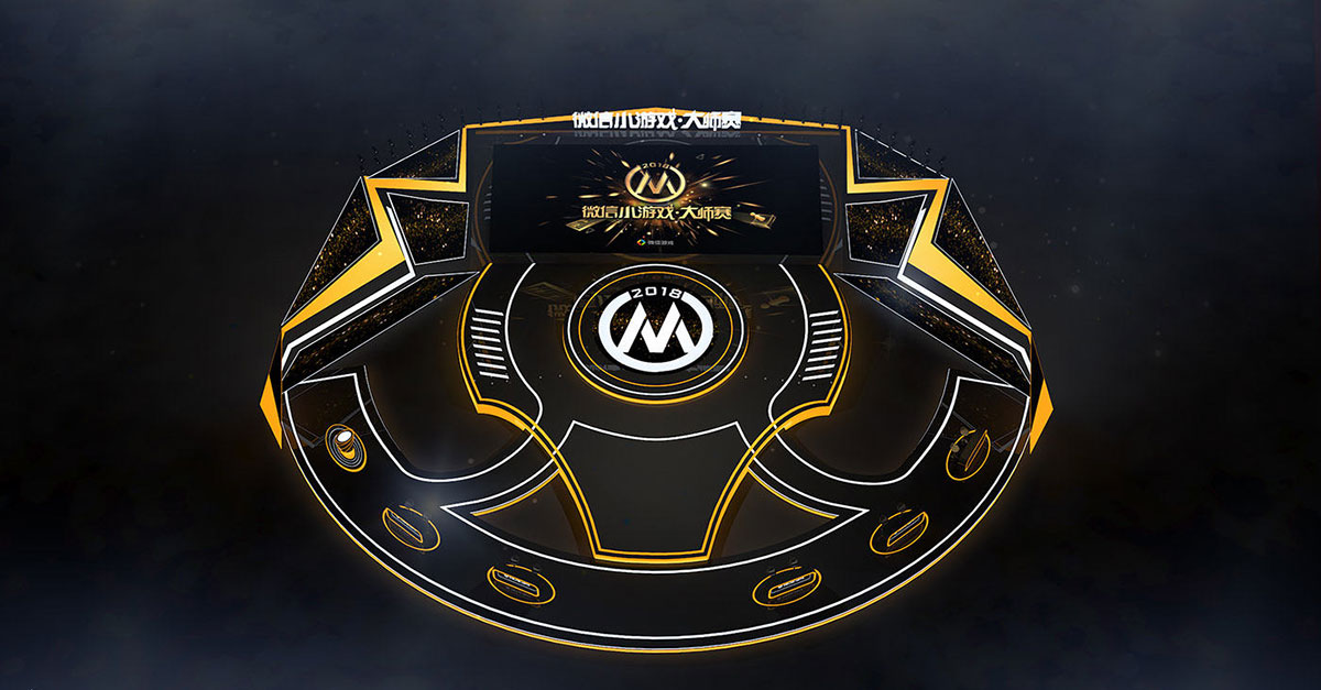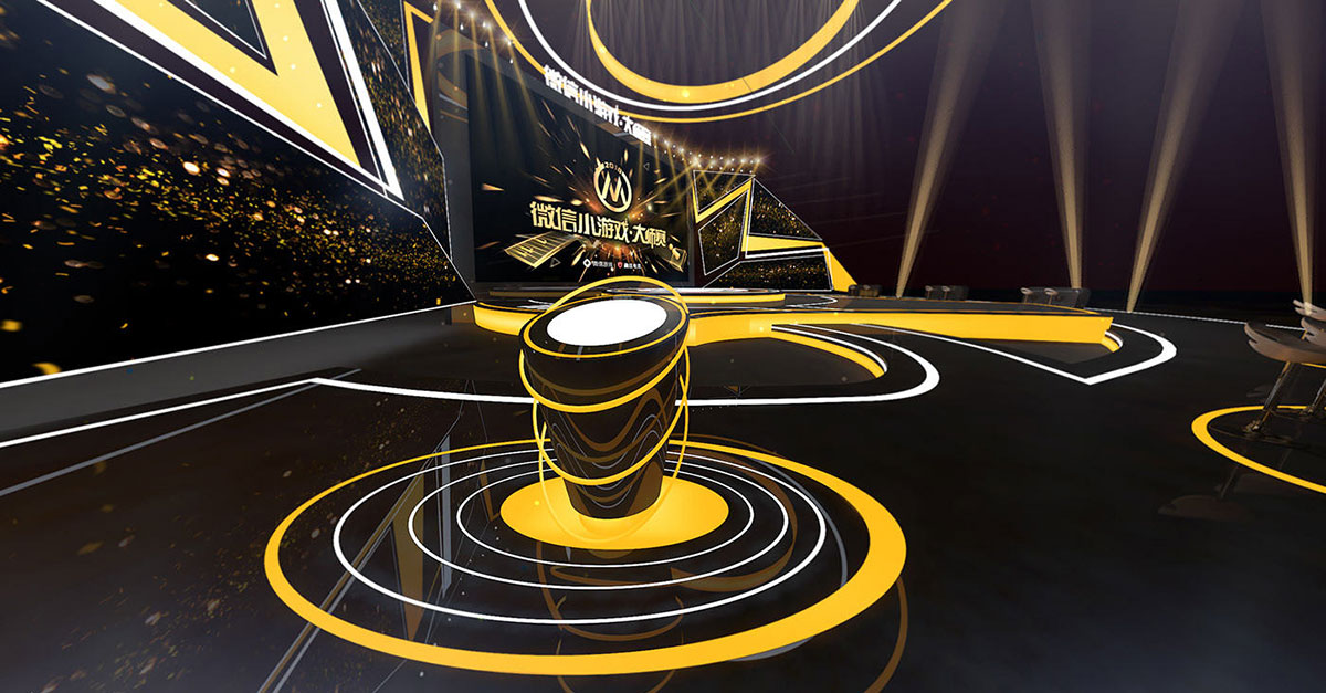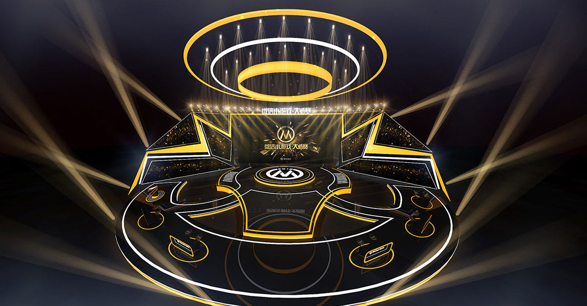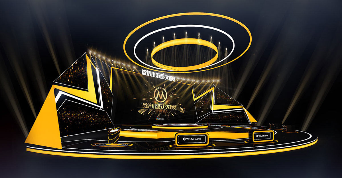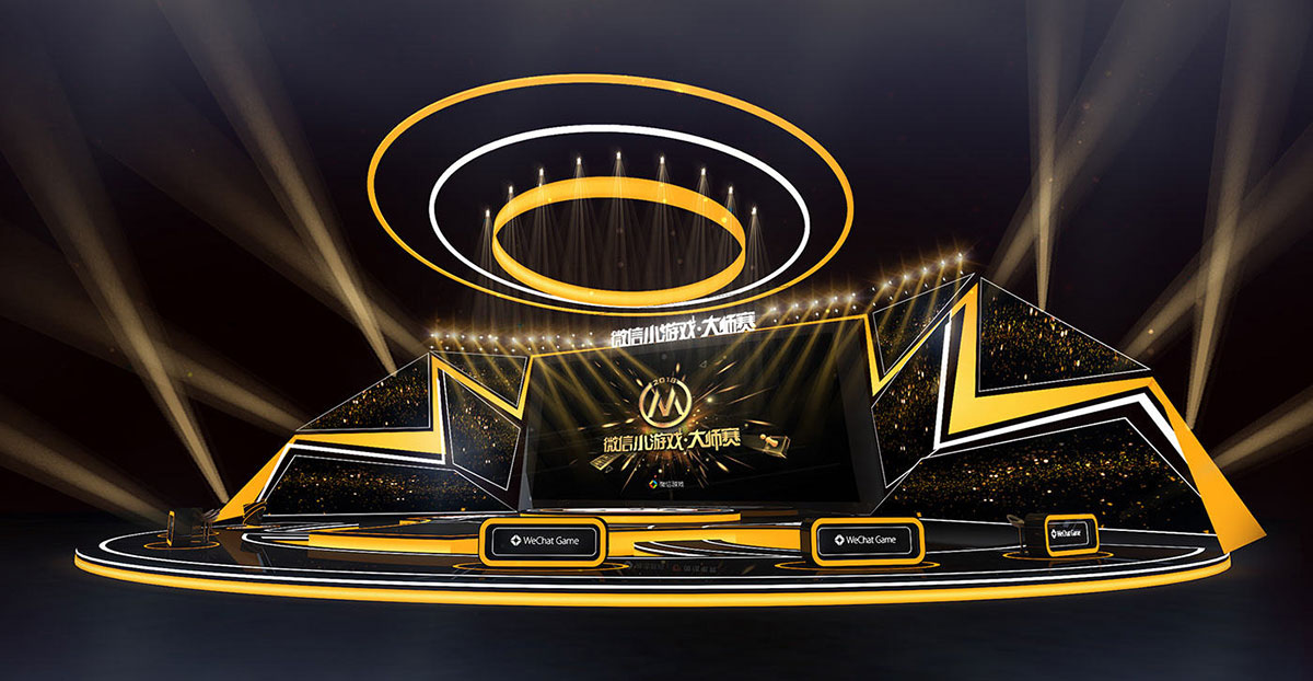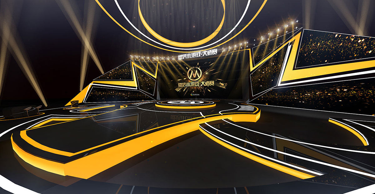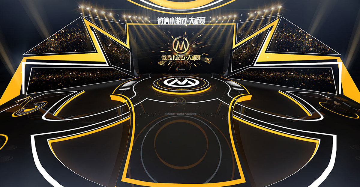 以明黃和經(jīng)典黑為主色調(diào)的微信小游戲大師賽的舞美設(shè)計(jì)更顯明亮和個(gè)性,兩邊明黃色的燈光猶如閃電般形狀,為整個(gè)現(xiàn)場(chǎng)增加了張揚(yáng)的個(gè)性主張,還把整體的光亮提亮了不少。