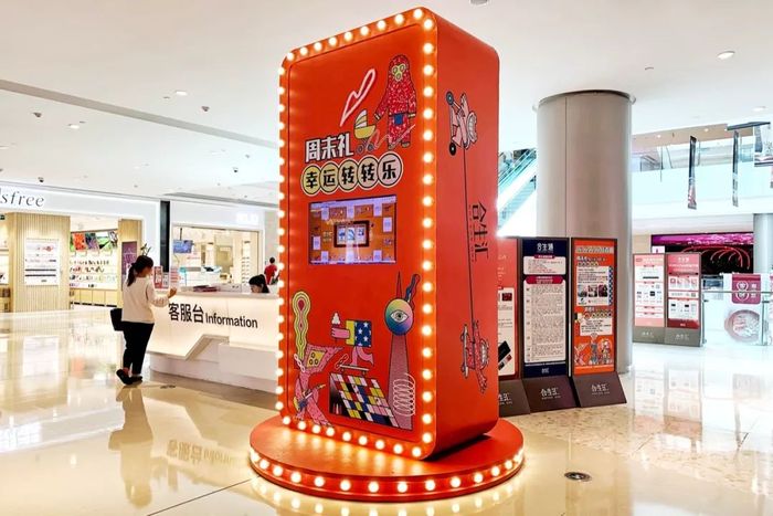 集裝箱,不算是創(chuàng)新元素,但也絕不過時,如果你想要制造一些年輕潮流氛圍,但又怕走偏,那在預算有限的情況下,集裝箱是不大會犯錯的選擇,而橙色,從上組畫面中就能感受到跳躍的興奮感。其次,主辦方在設計方面還邀請來自潮流藝術推廣機構(gòu)AMA簽約藝術家FELIX_勺子為商場量身定制帶來與周年慶主題同名的“慶生制造”- H TOWN!以此作為核心元素,延展在上文出現(xiàn)的集裝箱、圍擋、包柱等各種商場公區(qū)。圓形包柱,可以留意到涂料延伸到地面的細節(jié),需要塑造的就是整個商場都被“染橙了”的感覺。在商場整體氛圍的打造方面很是用心,但還不止如此,在一些互動裝置的設計方面,統(tǒng)統(tǒng)披上了周年慶氛圍的“外衣”,呈現(xiàn)在各個樓層的方方面面。