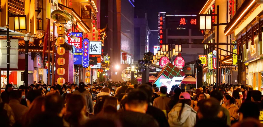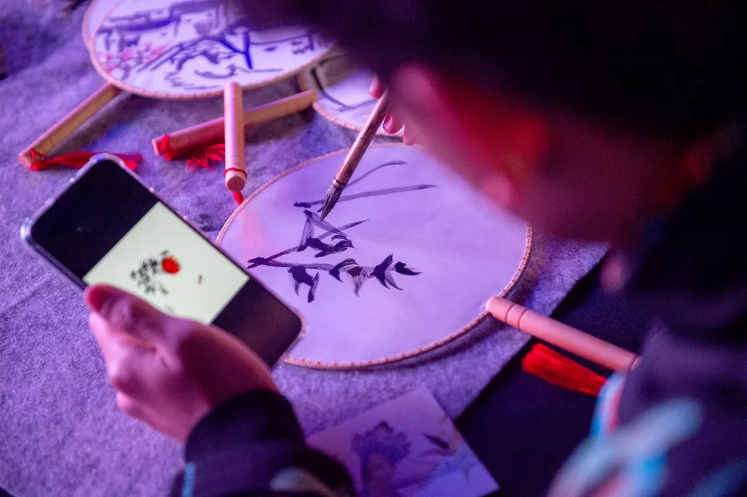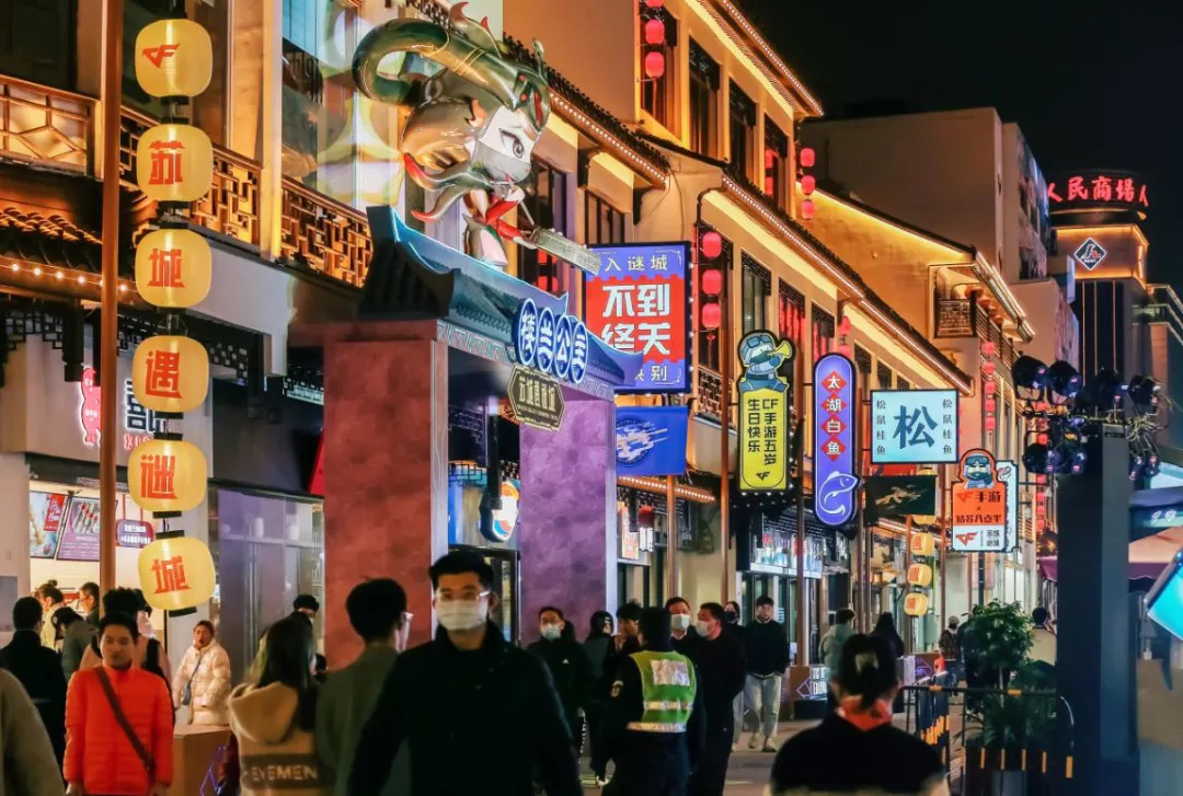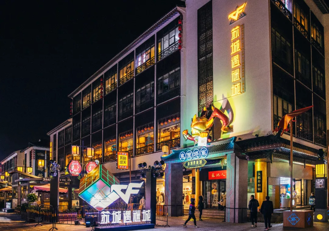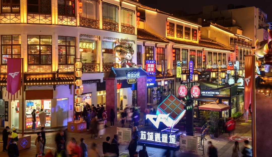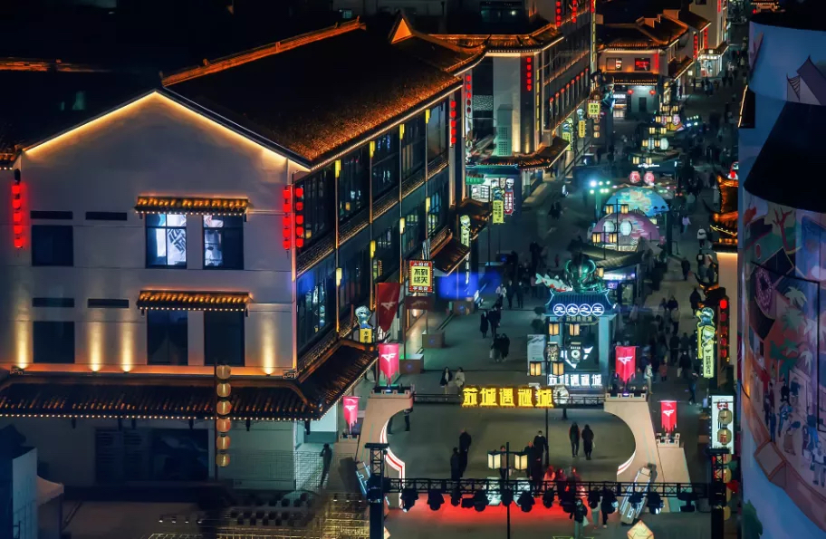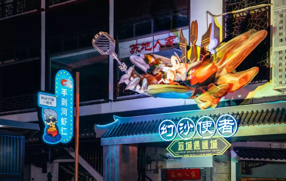 當(dāng)穿梭在百年歷史的觀前老街,映入眼簾的伏羲紋、蟲洞等游戲元素,仿佛讓人置身異世界,現(xiàn)場(chǎng)游客瞬間被蘇州夜景的全新面貌吸引。