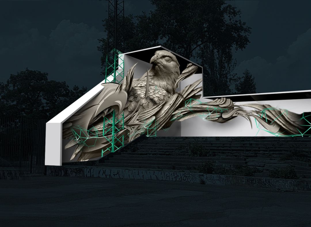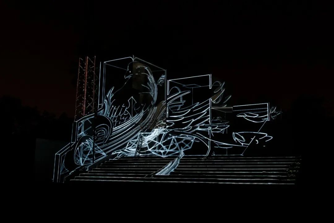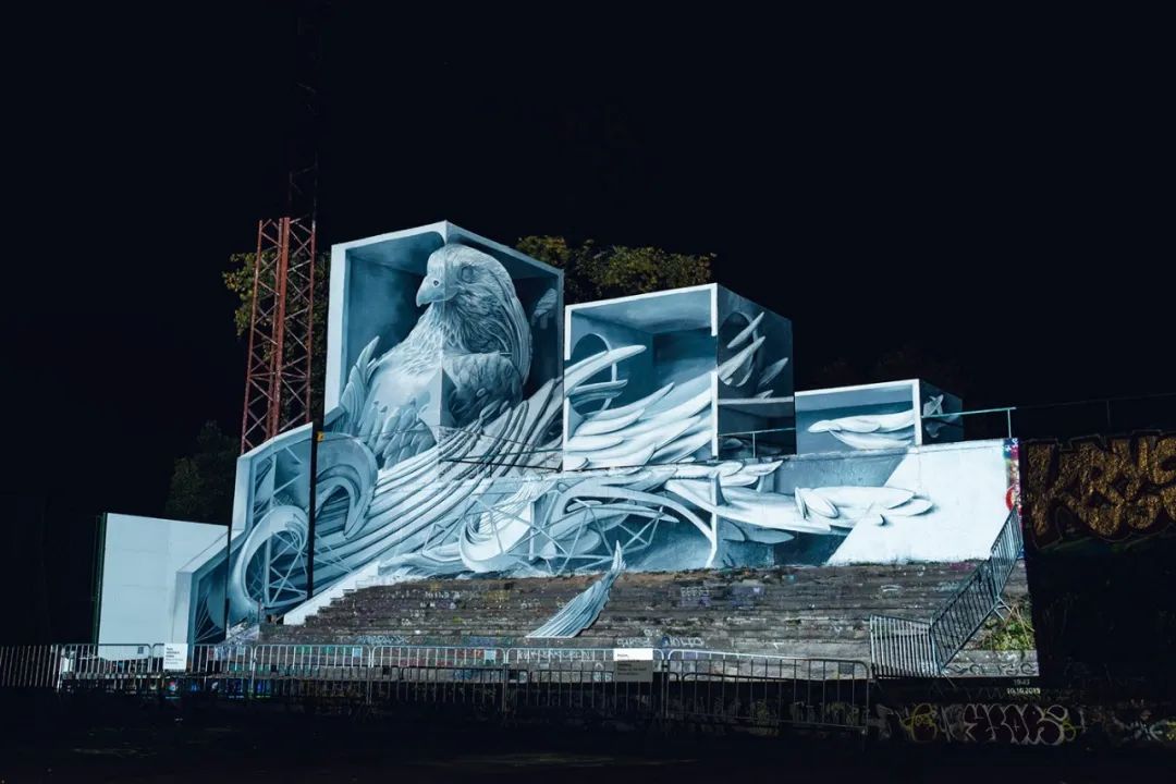 信號節(jié)是在捷克共和國布拉格舉行的為期四天的燈光藝術(shù)和新興技術(shù)節(jié)。今年信號節(jié)的主題是“下一個 100 年”,團隊抓住了靈感,將舊瀝青運動場的一堵墻作為畫布,獵鷹作為一個統(tǒng)一的元素,想象在未來百年涂鴉場景會發(fā)生什么,描繪街頭藝術(shù)可能的烏托邦式未來,在觀眾面前呈現(xiàn)的是一場視覺之旅。投影內(nèi)容以 5 分鐘為循環(huán),代表了未來 100 年街頭藝術(shù)場景中的所有場景。此次藝術(shù)展覽在短短4天內(nèi)就吸引了大約50萬人前來參觀該作品。此項目將尖端技術(shù)、定制音樂與街頭藝術(shù)融合在一起,動畫投影照亮了涂鴉,將觀眾從現(xiàn)實帶入了身臨其境的多維體驗。