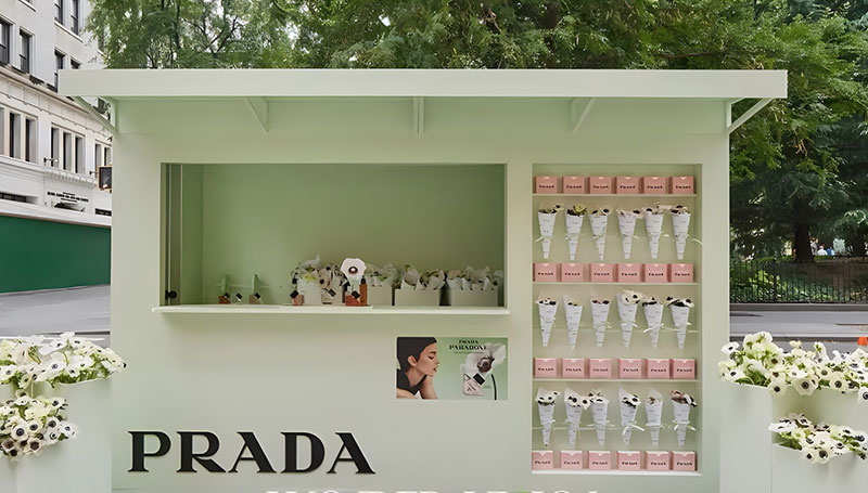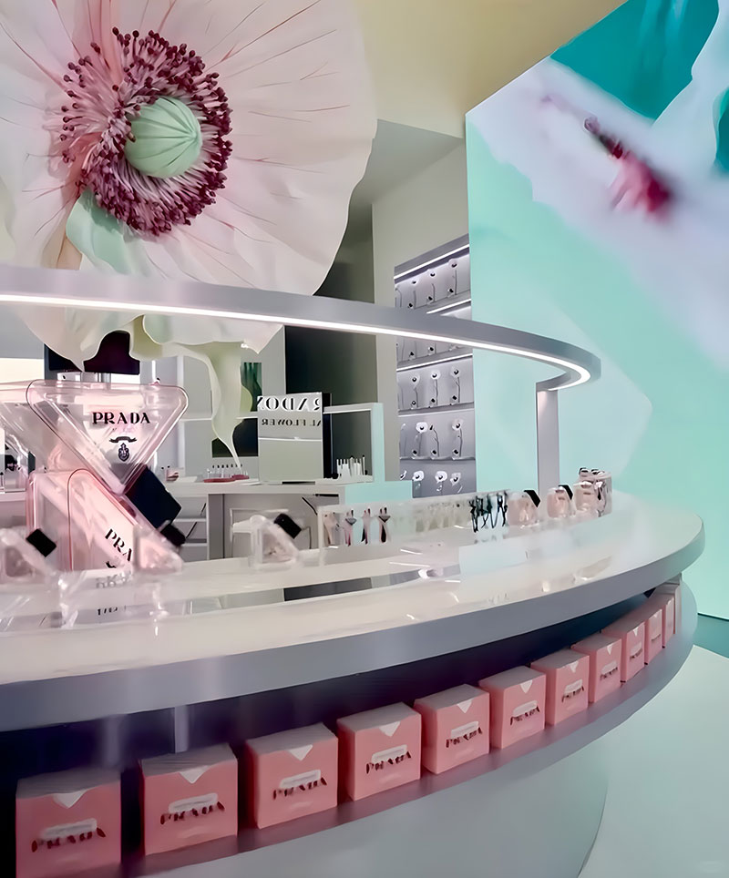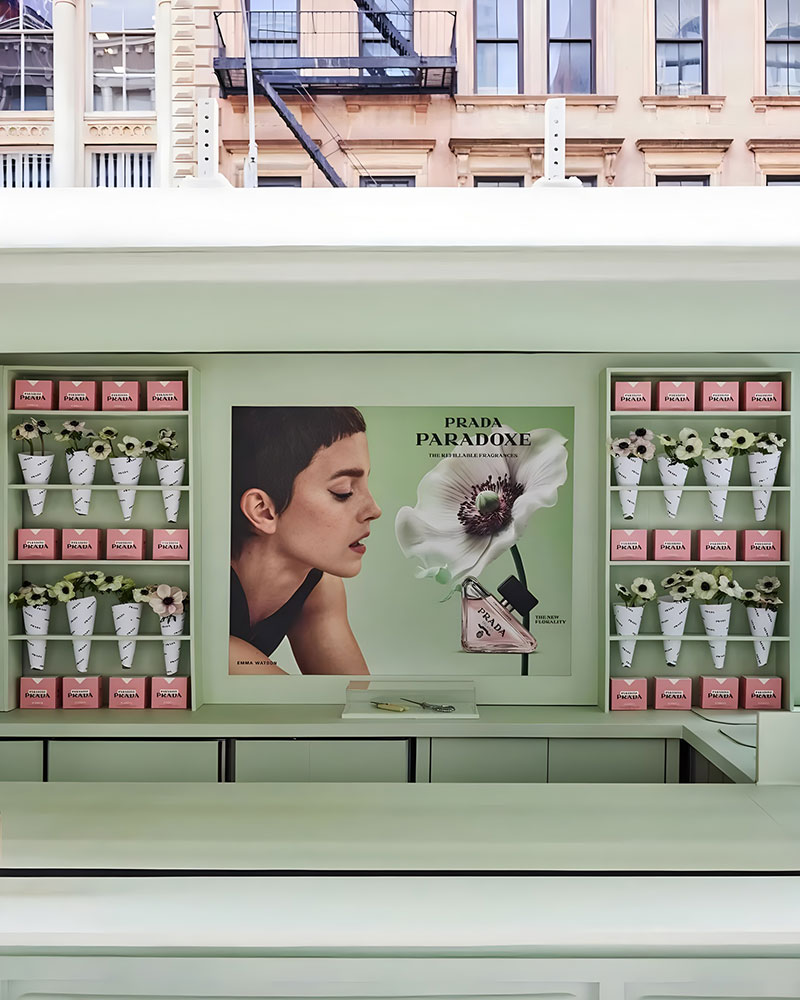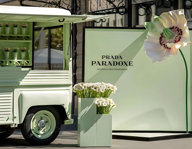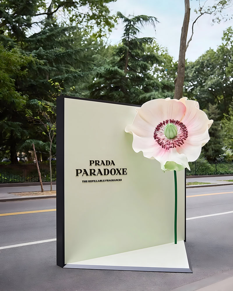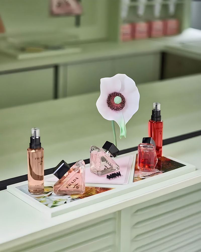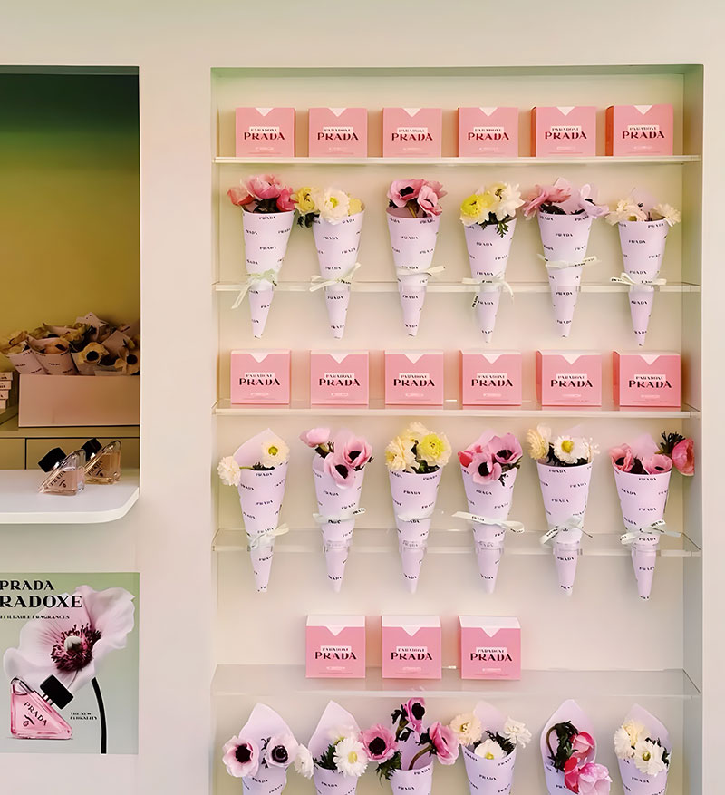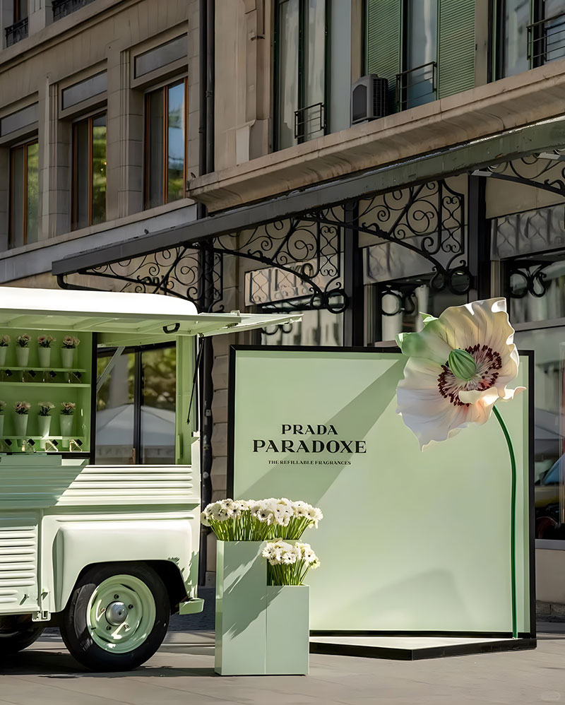 為了推廣 Paradoxe Virtual Flower 香水,普拉達(dá)精心設(shè)計(jì)了備受矚目的時(shí)刻,注重細(xì)節(jié)與設(shè)計(jì),沉浸式的氣味體驗(yàn)室,充滿香水氣泡,精心策劃的花市。