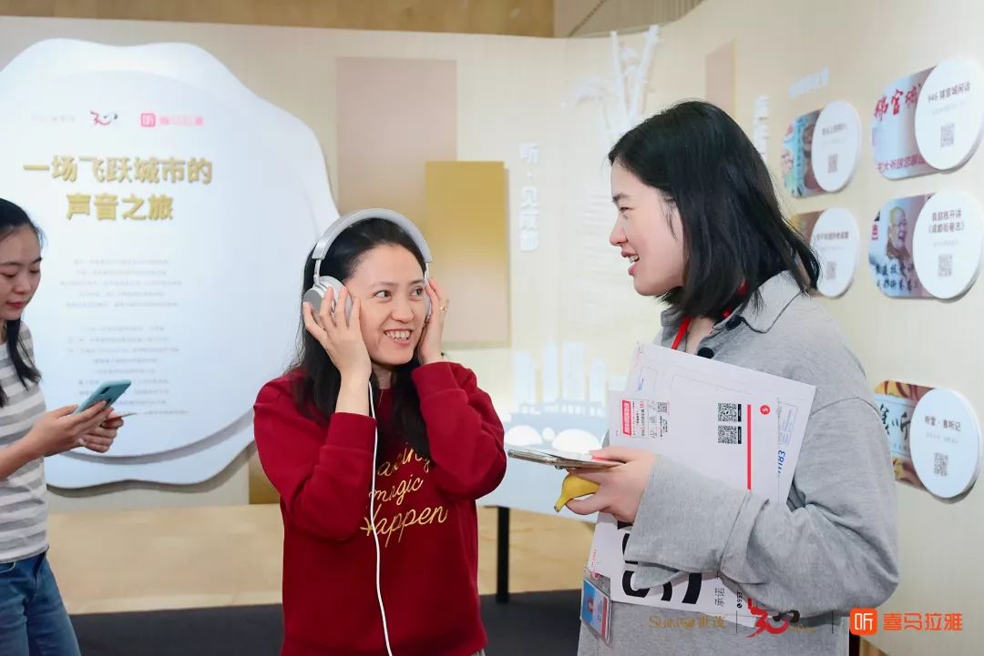 在特設(shè)的“聲音圖書館”展區(qū)中參觀者只需簡單掃描二維碼就能輕松收聽到來自:歷史軼事、城市發(fā)展、城市旅游及美食等在內(nèi)的24個節(jié)目供聽閱,細(xì)數(shù)所在城市的前世今生;“耳機森林”互動區(qū)也開辟了一個全新的體驗空間,喜馬拉雅特別精選了站內(nèi)人氣最高的有聲讀物和各類名家大師們的人生智慧,戴上耳機后閉上眼睛,帶你一起徜徉在聽書的世界。