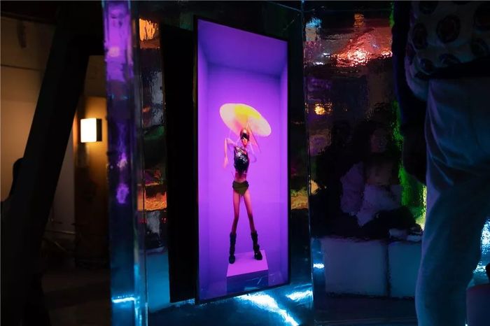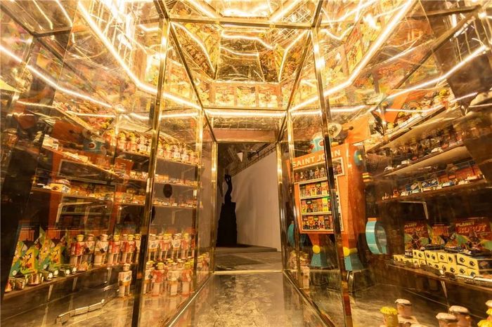 展覽現(xiàn)場,90后藝術(shù)家李琳琳打造了一個巨大的裝置蛋糕,里面放滿了陳國泰收藏的玩具,組成了一個仙氣十足的夢幻王國。