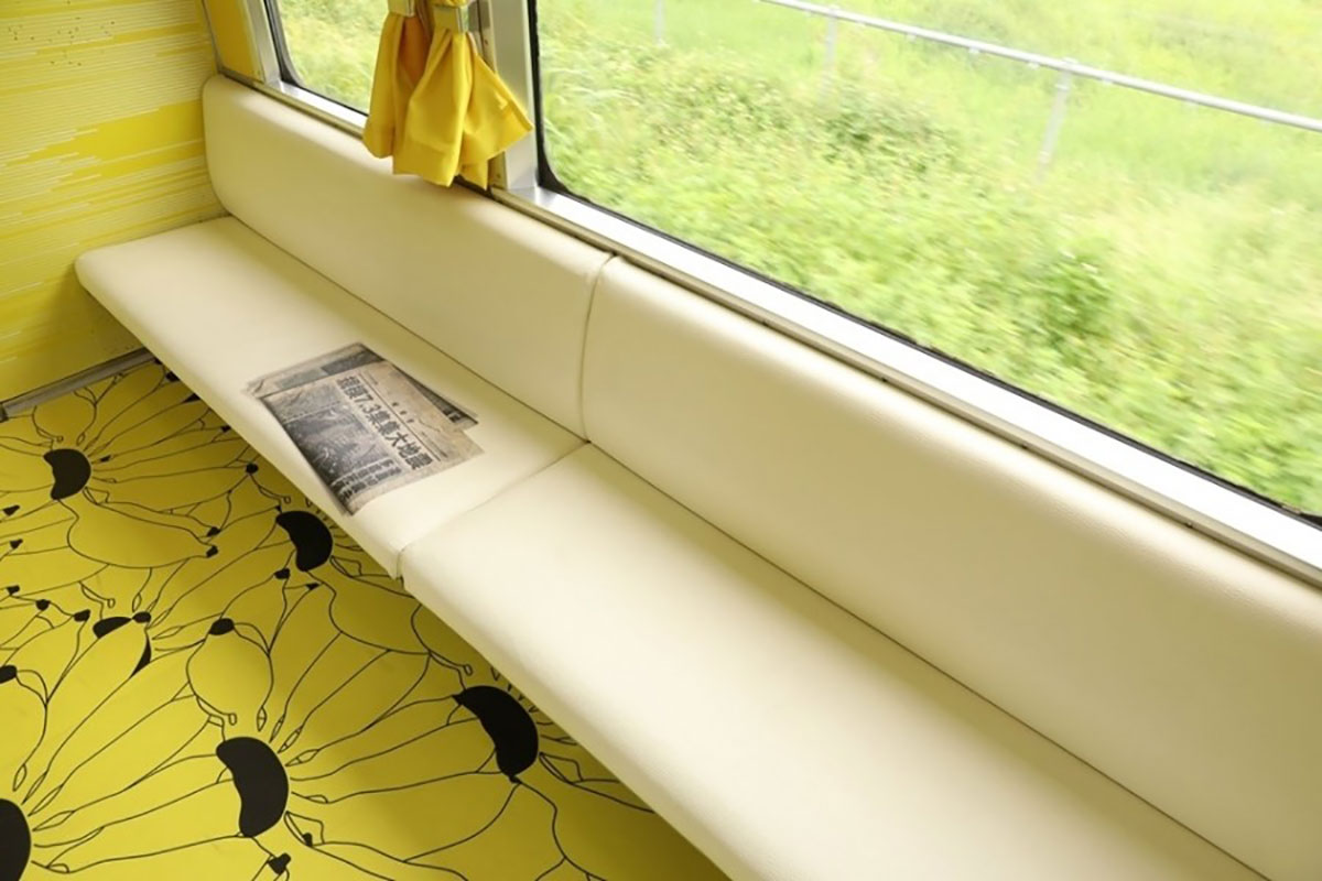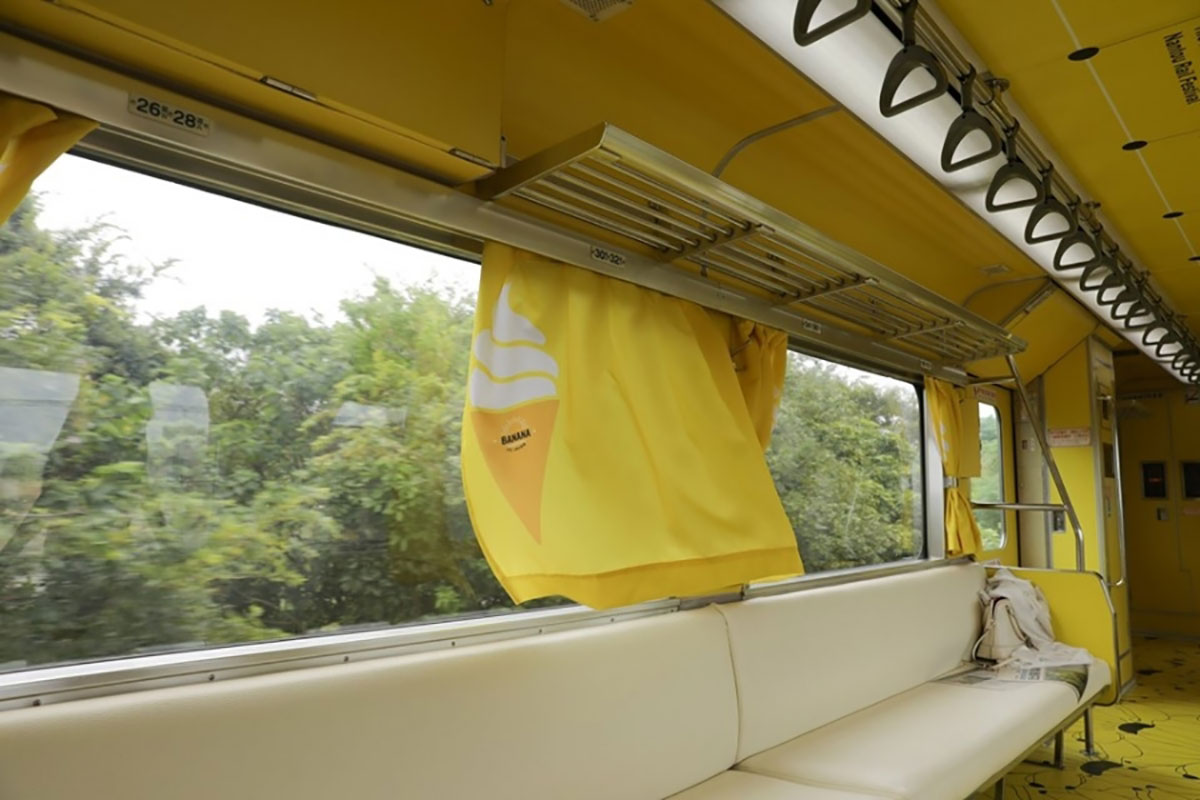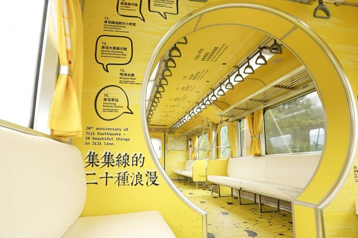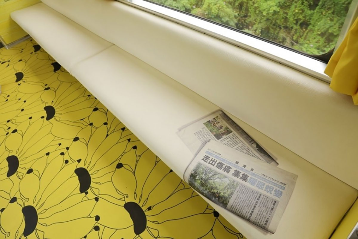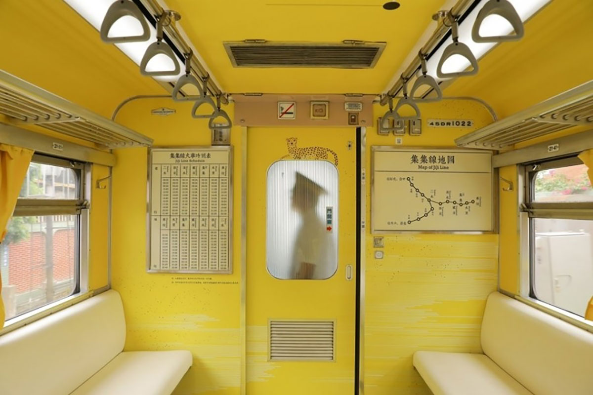 車身中使用的金色香蕉色來自集集的經(jīng)濟(jì)作物“山香蕉”,它與這種顏色交織在一起,聚集了所有的輝煌時代?;疖囓嚿淼拿總€角落都經(jīng)過改造,這也是是第一次臺鐵車廂內(nèi)部100%被單一顏色覆蓋,視覺強(qiáng)烈,簡潔,大氣。
