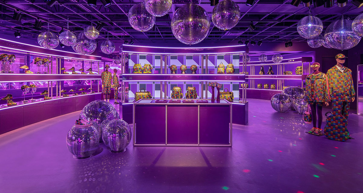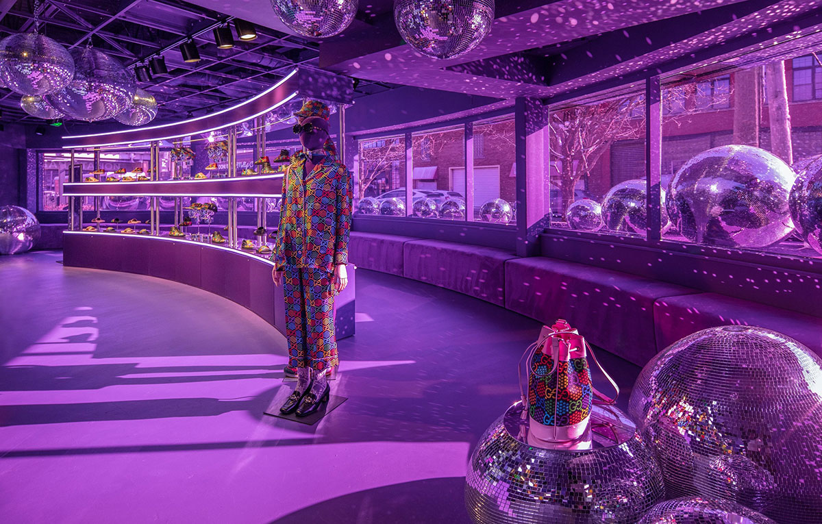 GUCCI 古馳快閃店位于芝加哥,開放至3月底,其中設計大量使用#GGPsychedelic 元素,懷舊氛圍濃重,不管是立體設計還是迪斯科燈球都讓空間充滿復古氣質。原文說保留了1970年代迷幻精神,并邀請游客進入夢幻般的夜總會。
