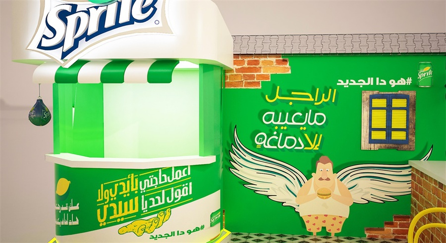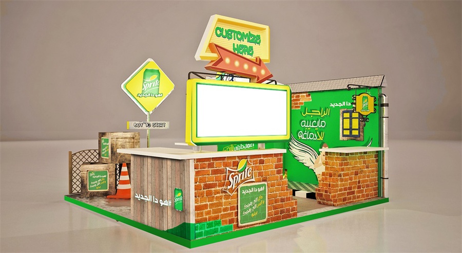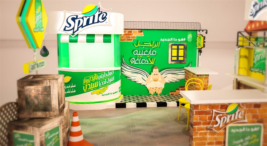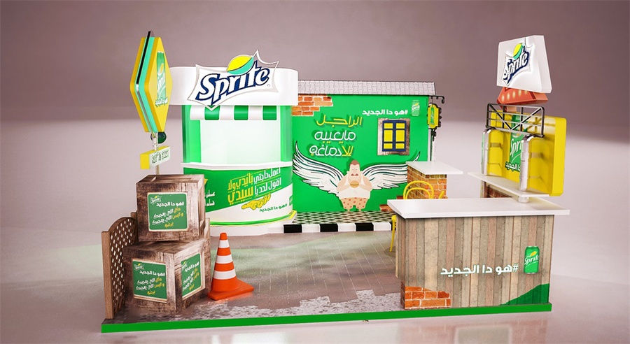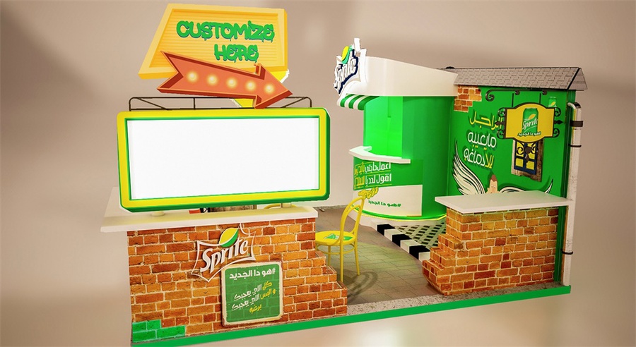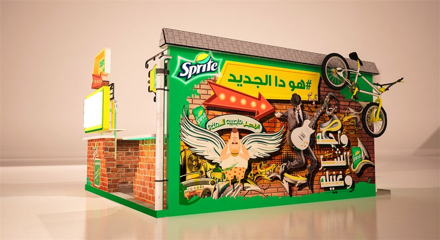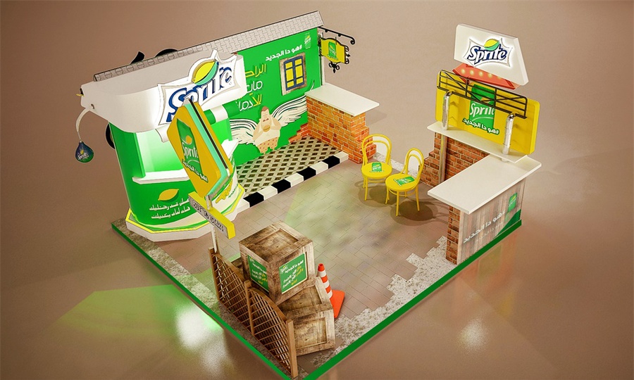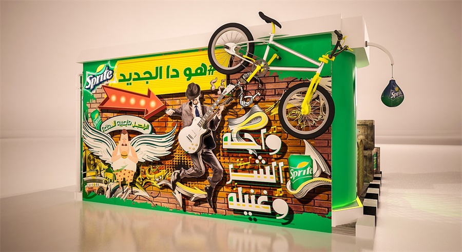 雪碧街頭體驗(yàn)快閃店活動(dòng)策劃采用了做舊的設(shè)計(jì)風(fēng)格,立體的形象墻很值得借鑒,除了安裝一輛真實(shí)的自行車,其它都是KT板加寫真。